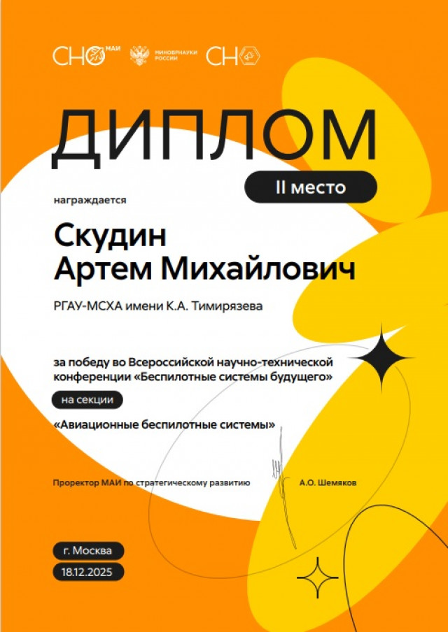 Выпускник Цифровой кафедры Российского государственного аграрного университета – МСХА имени К.А. Тимирязева удостоен высокой награды на Всероссийской научно-технической конференции «Беспилотные системы будущего». Мероприятие, организованное Московским авиационным институтом (МАИ) при поддержке Министерства науки и высшего образования Российской Федерации и Студенческого научного общества МАИ, собрало более 40 молодых исследователей из ведущих вузов страны.