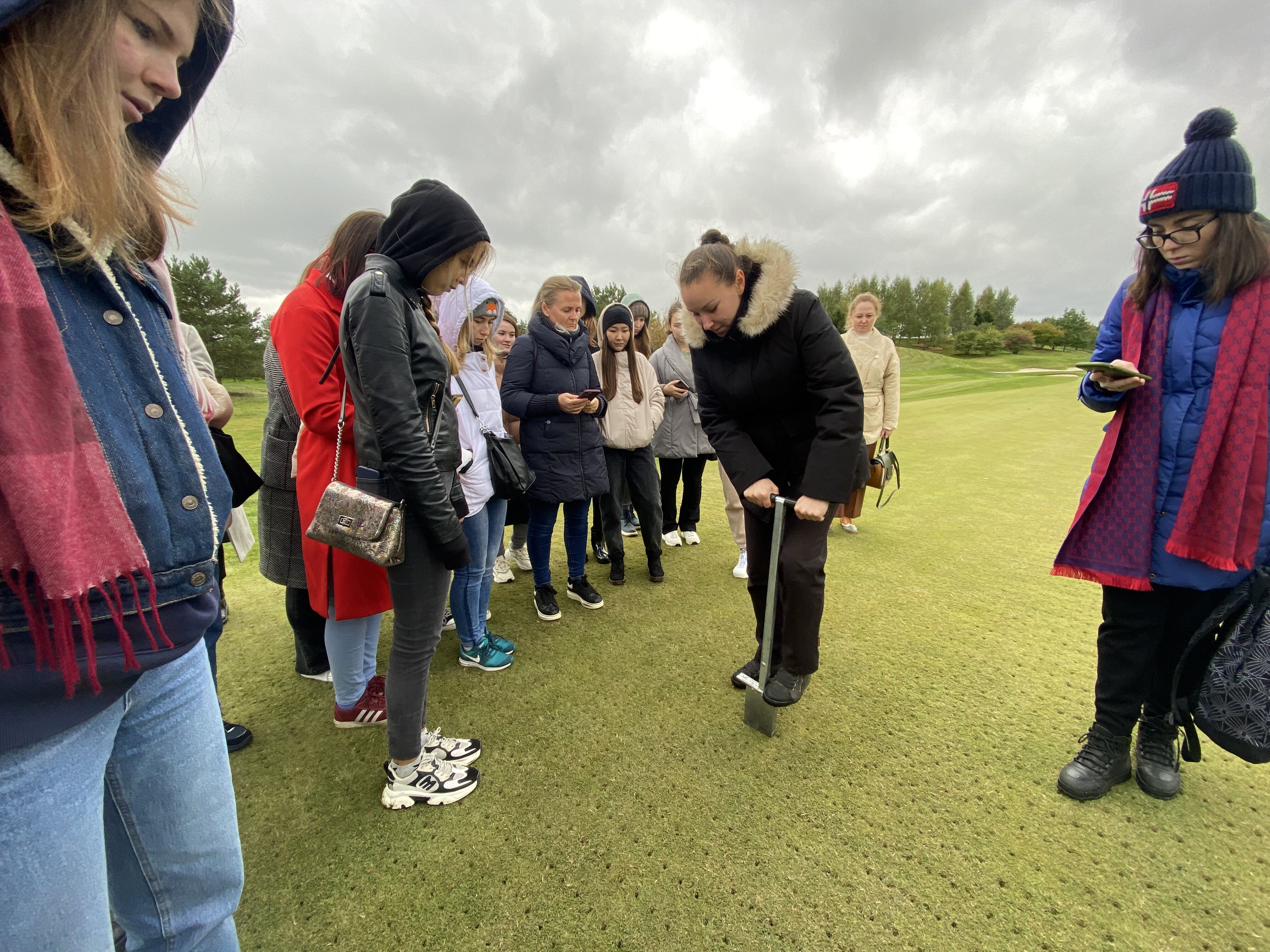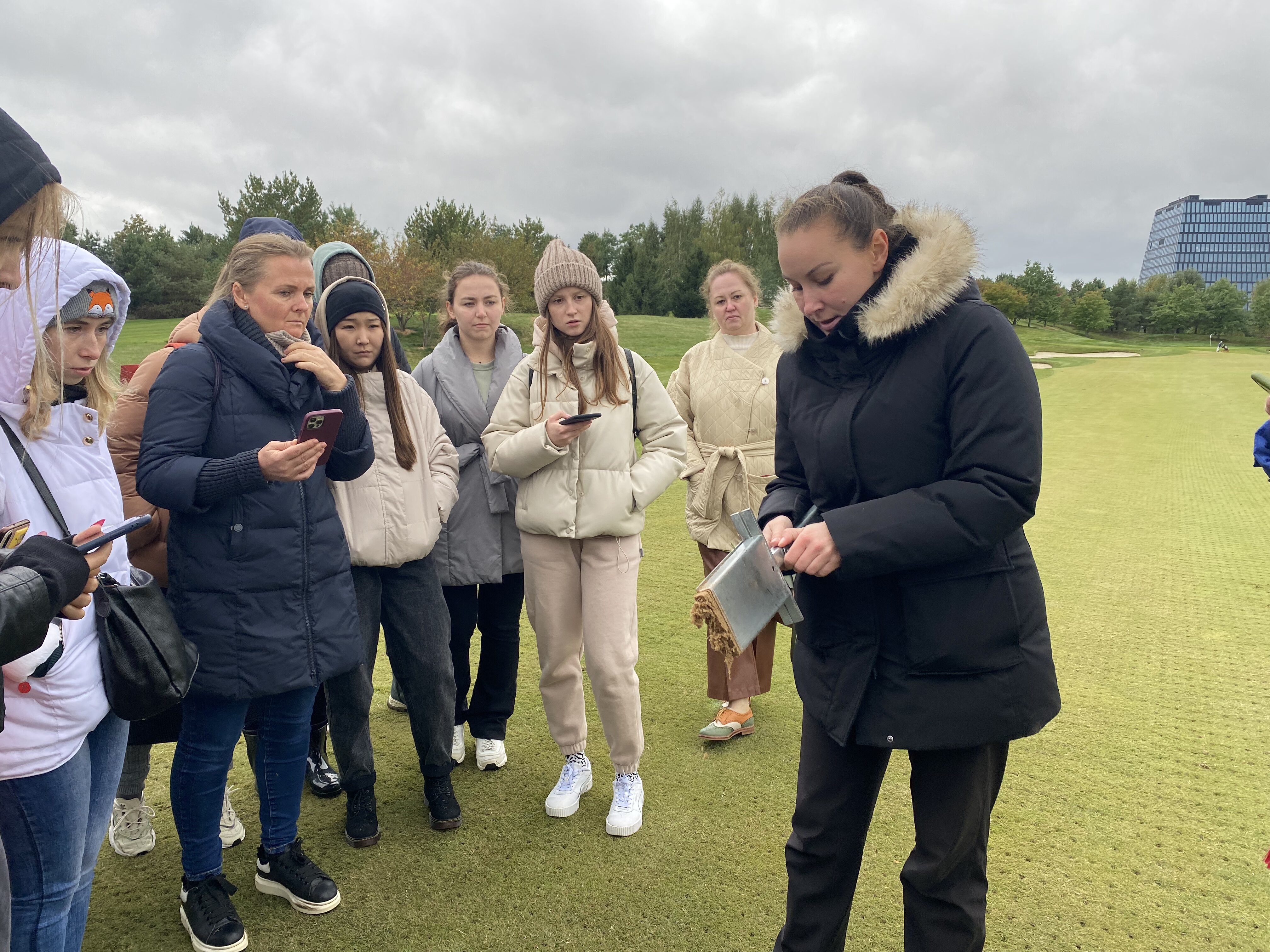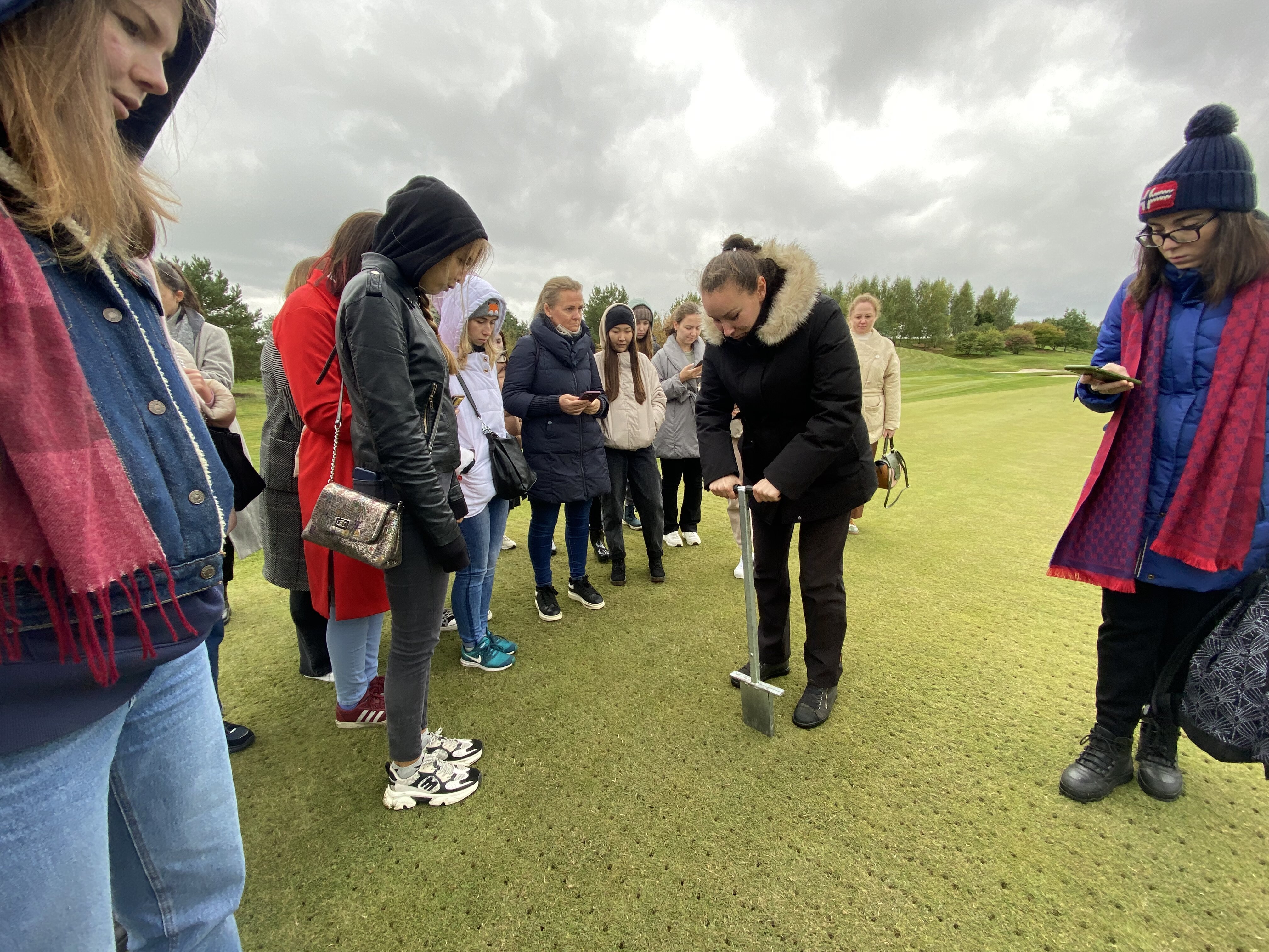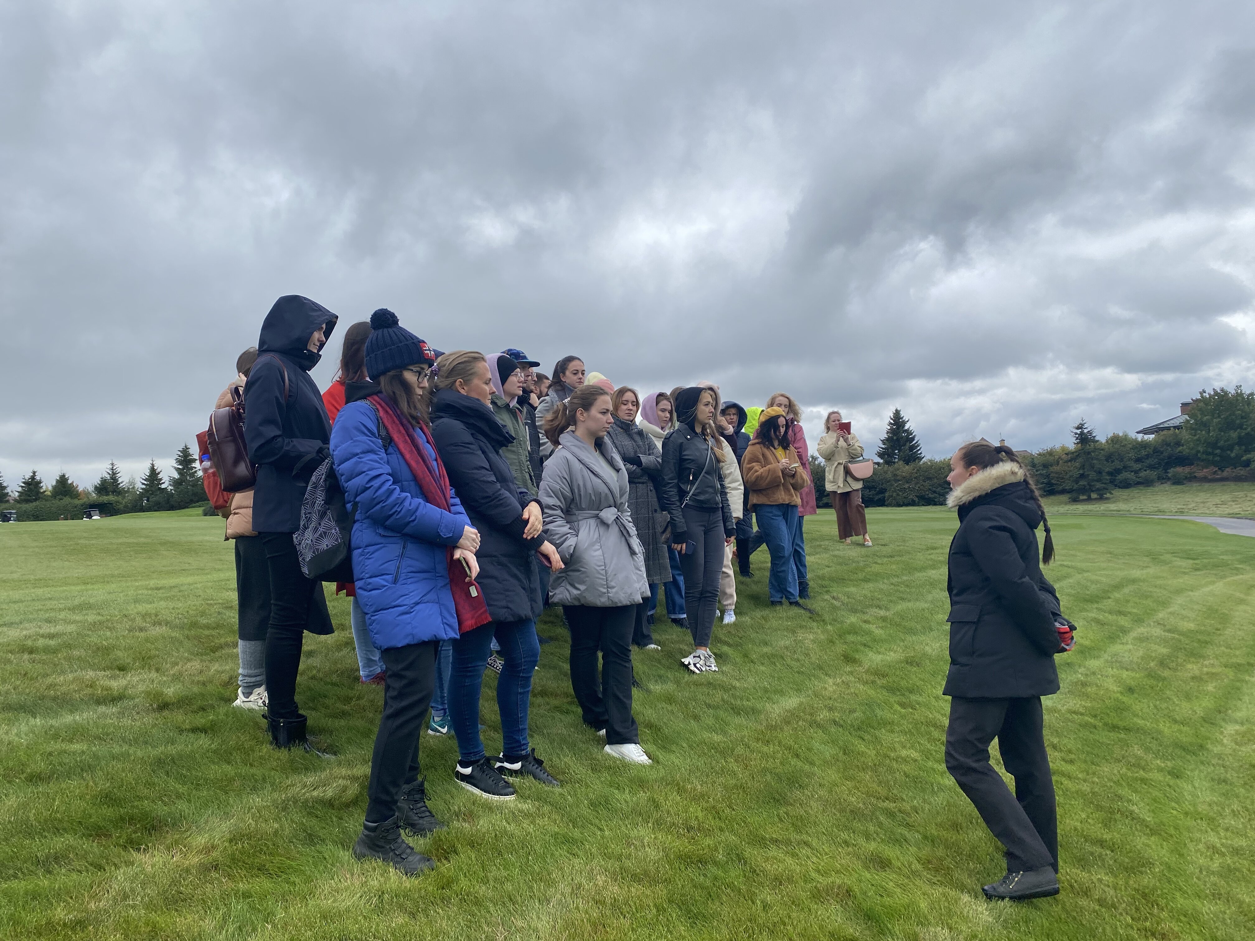 Экскурсию по клубу студентам провела главный агроном, выпускница Института Садоводства и ландшафтной архитектуры Новолодская Милана Сергеевна. Она ознакомила студентов с планом расположения лунок на гольф-поле, рассказала, что данное поле выполнено по  стилю Паркленд, так же рассказала об особенностях и функциях каждого участка на игровом поле. Студенты ознакомились с растительным составом используемый на территории и узнали какие травы для газонов используются на различных участках игрового поля.
