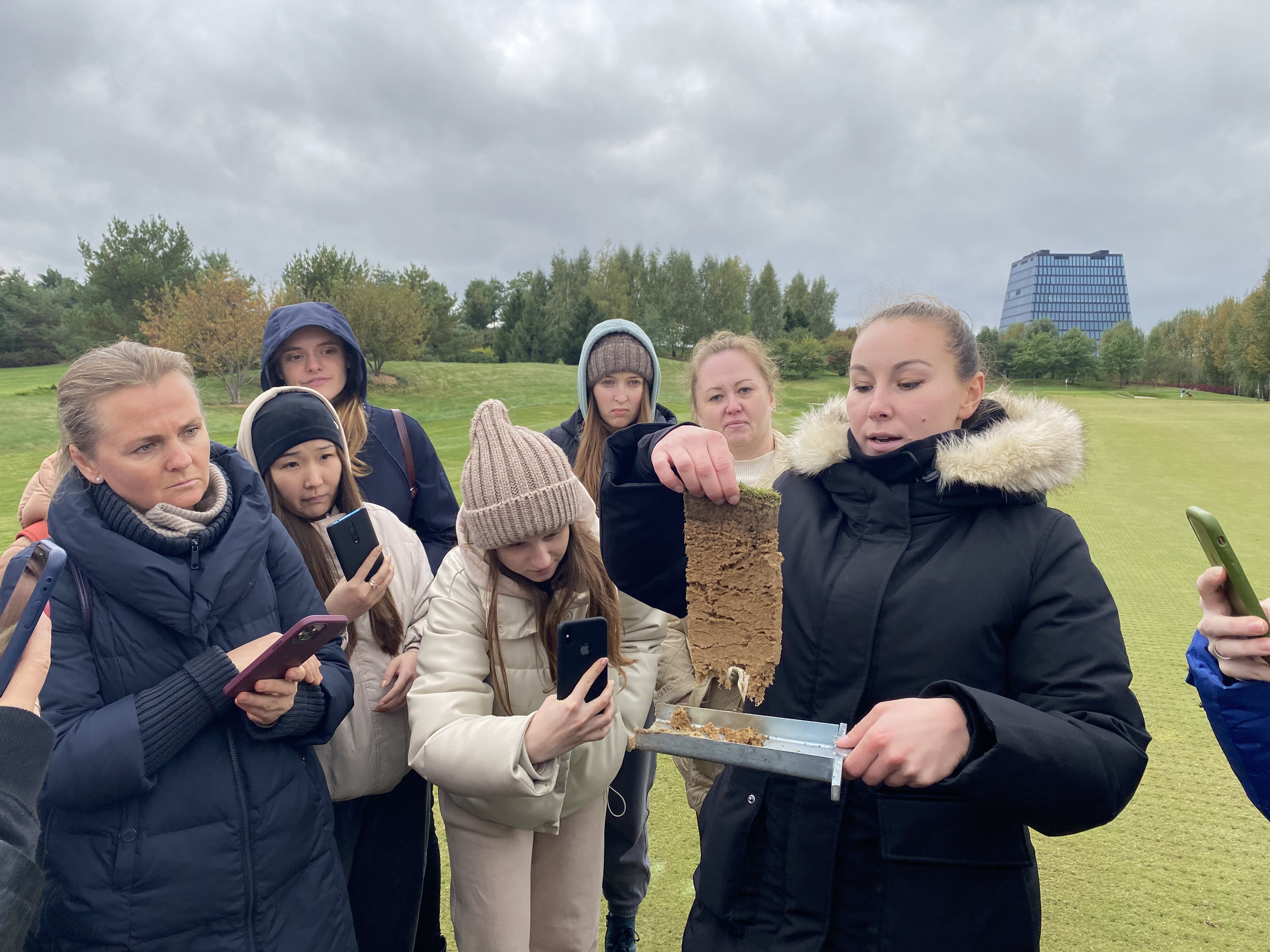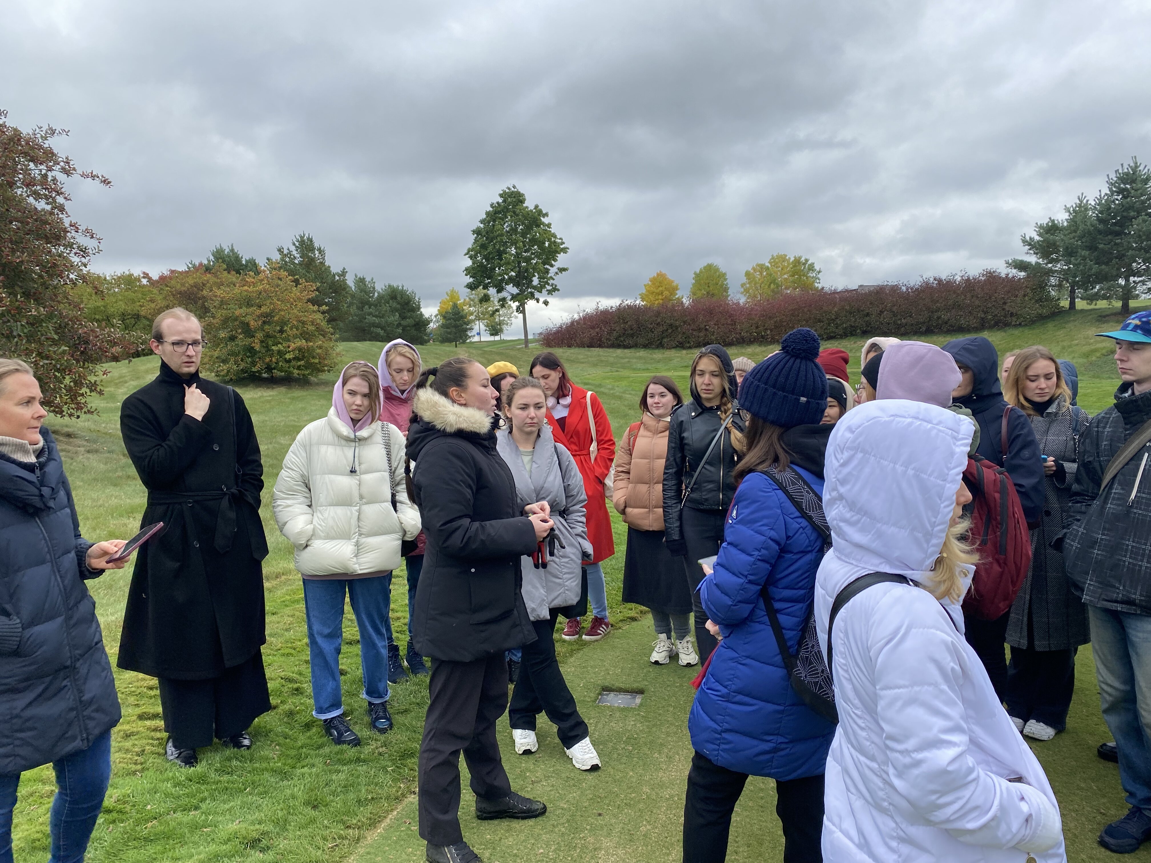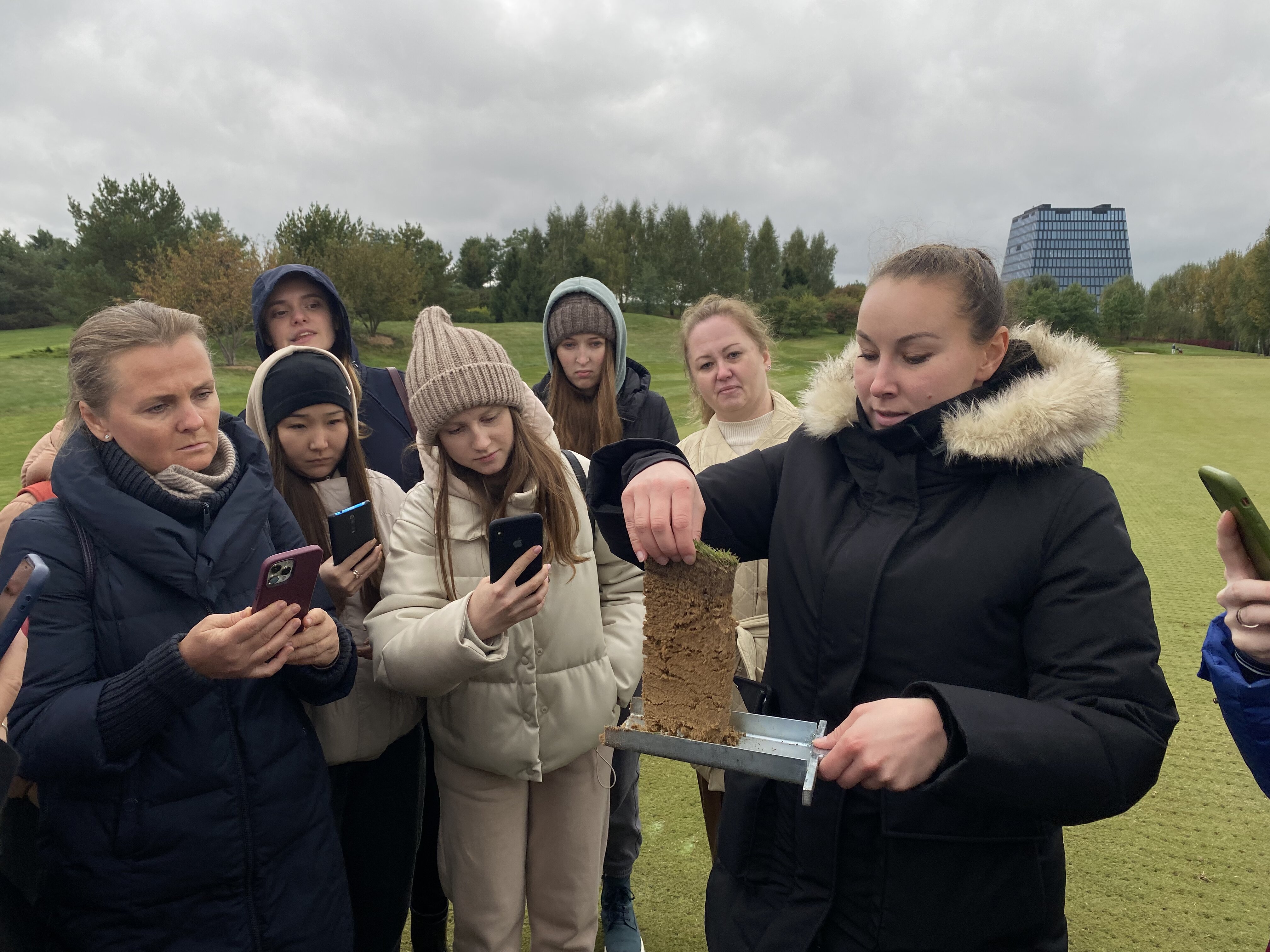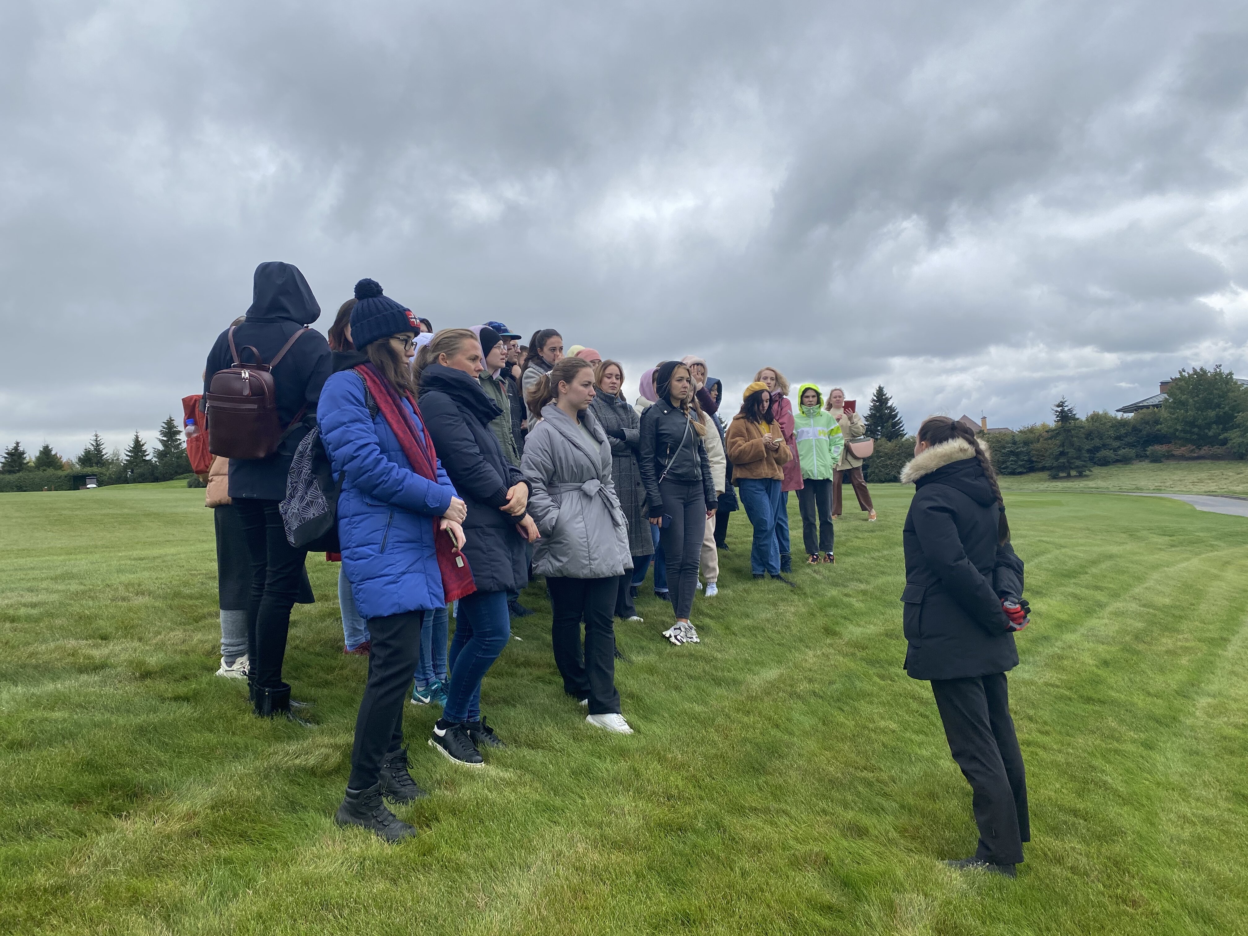 Экскурсию по клубу студентам провела главный агроном, выпускница Института Садоводства и ландшафтной архитектуры Новолодская Милана Сергеевна. Она ознакомила студентов с планом расположения лунок на гольф-поле, рассказала, что данное поле выполнено по  стилю Паркленд, так же рассказала об особенностях и функциях каждого участка на игровом поле. Студенты ознакомились с растительным составом используемый на территории и узнали какие травы для газонов используются на различных участках игрового поля.