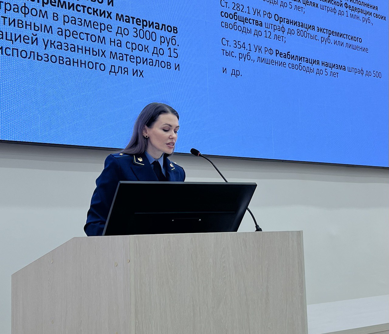 11 Октябрь / 2022В ходе лекции помощница прокурора А.К. Коцюба пояснила студентам, что такое экстремизм, экстремистская деятельность и экстремистские материалы. Особое внимание она уделила вопросам ответственности за совершение правонарушений и преступлений в этой сфере.