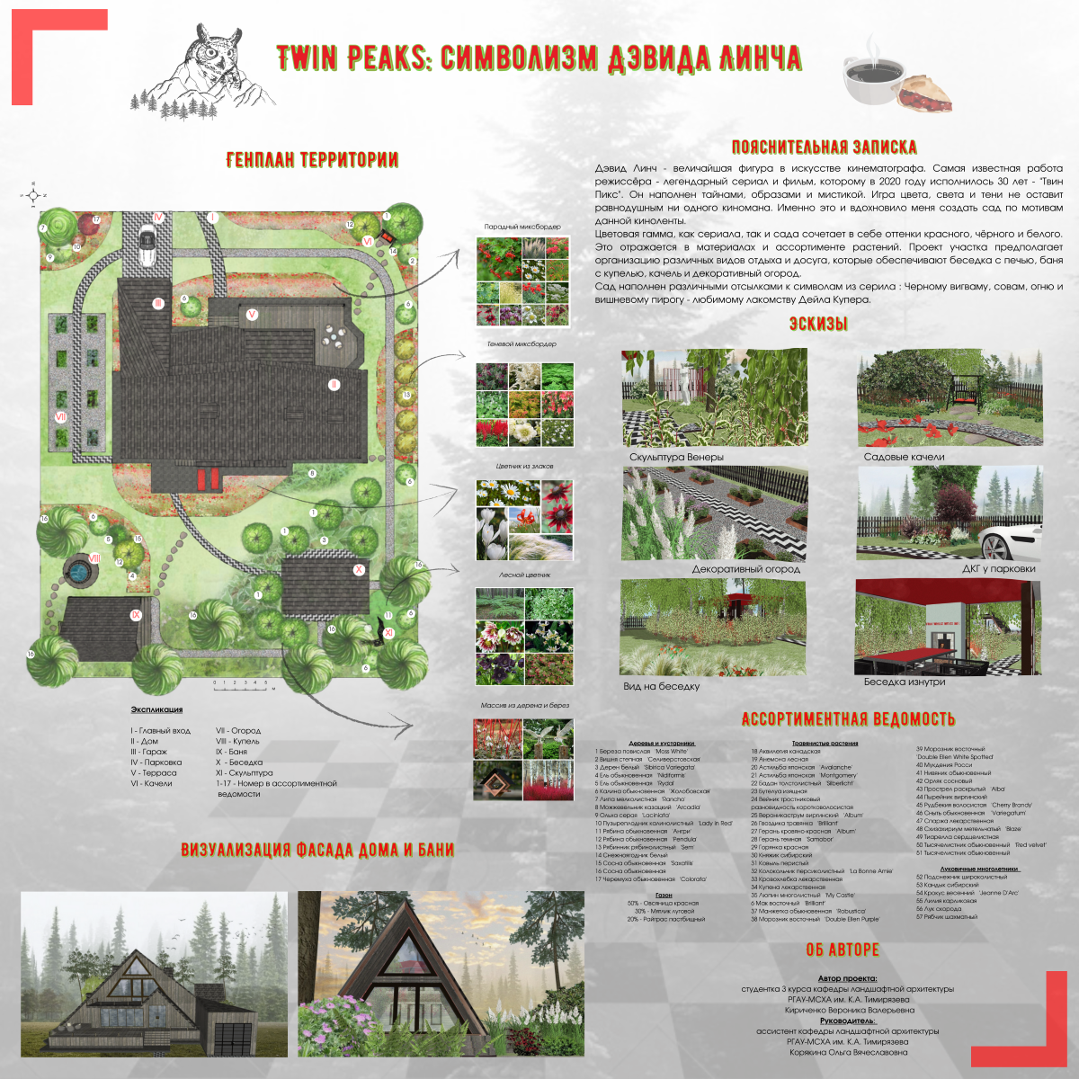 Творческая идея Вероники Кириченко носит название «Twin Peaks: символизм Дэвида Линча». Легендарный сериал и фильм, которому в 2020 году исполнилось 30 лет, вдохновил на создание интригующего и загадочного проекта частного пространства настоящего киномана. Цветовая гамма как сериала, так и сада сочетает в себе оттенки красного, чёрного и белого.