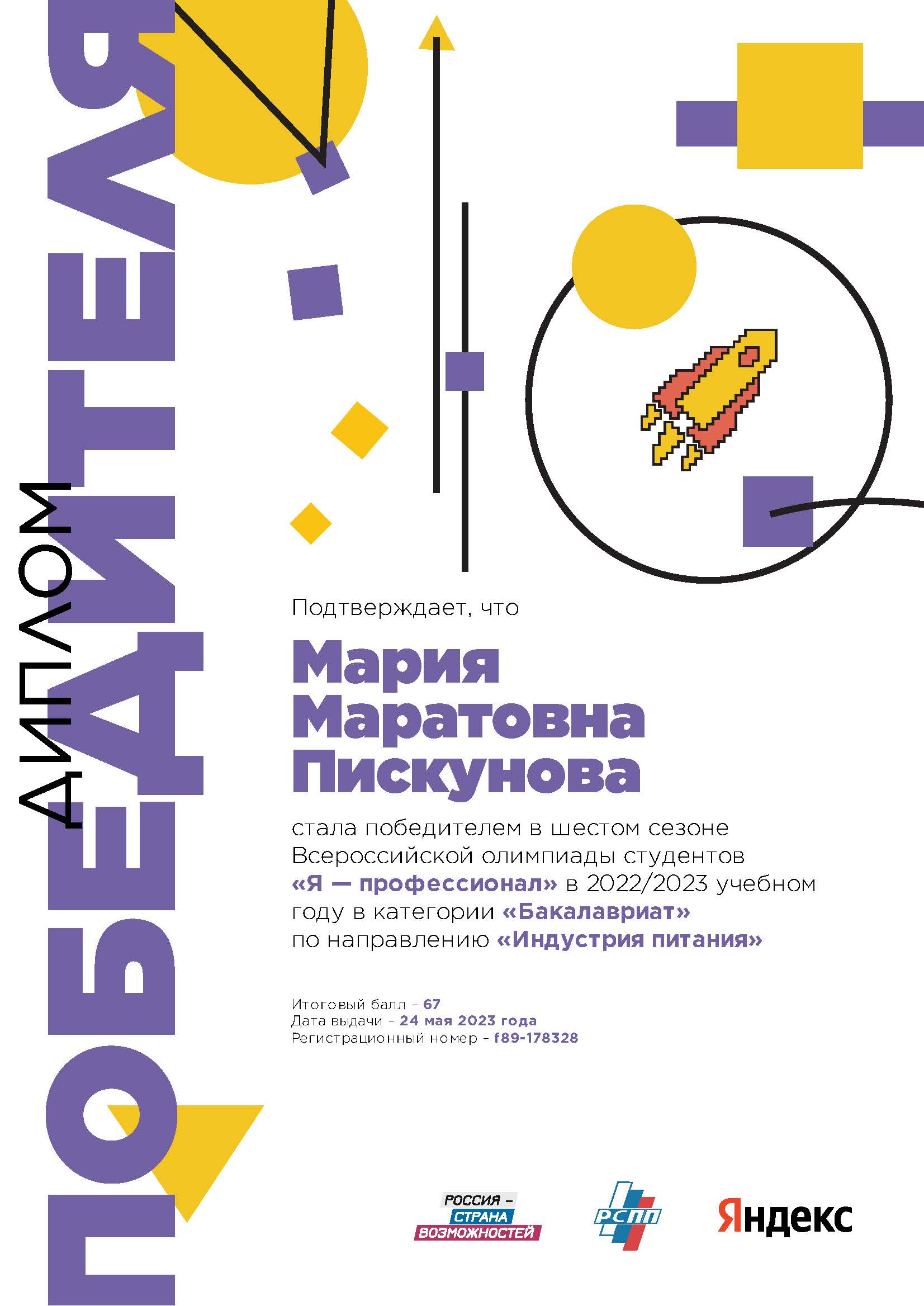 Студентка Технологического института Пискунова Мария Маратовна (группа Д-Т302) стала победителем VI сезона всероссийской олимпиады «Я — профессионал» в 2022-2023 учебном году в категории «Бакалавриат» по направлению «Индустрия питания».