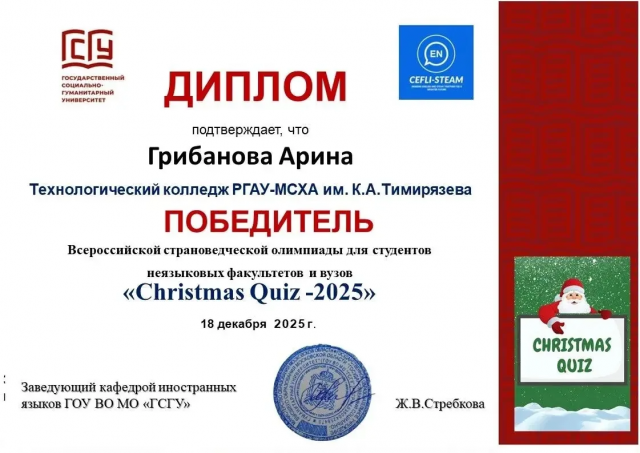 Подведены итоги Всероссийского конкурса на английском языке «Christmas Quiz-2025», организованного кафедрой иностранных языков Государственного социально-гуманитарного университета Московской области. Конкурс проходил среди студентов неязыковых специальностей и собрал более тысячи участников со всей страны.