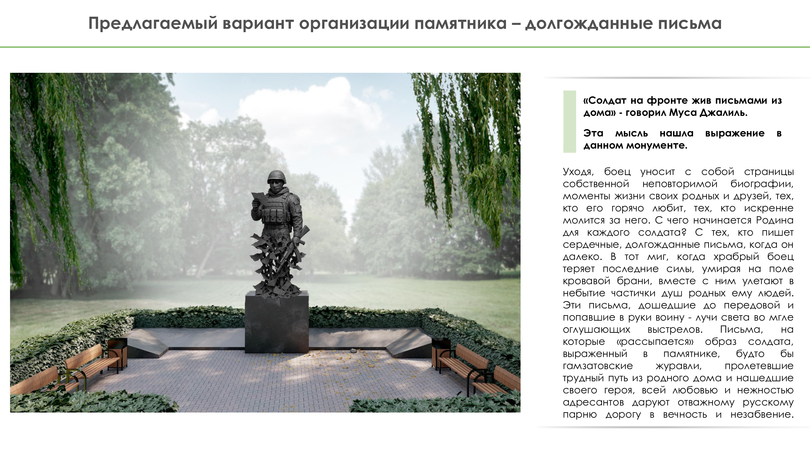 «В городской среде, полной движения и перемен, особенно важно находить точки, где можно остановиться - не физически, а внутренне. Мемориальные зоны - это не просто архитектурные элементы. Это места, где сохраняется живая память о солдатах, прошедших через войну и оставивших за собой не только историю, но и тишину, к которой хочется прислушаться. Памятники нужны, чтобы помнить не даты — а людей. Не войну — а цену мира»,- рассказывает будущий ландшафтный архитектор.