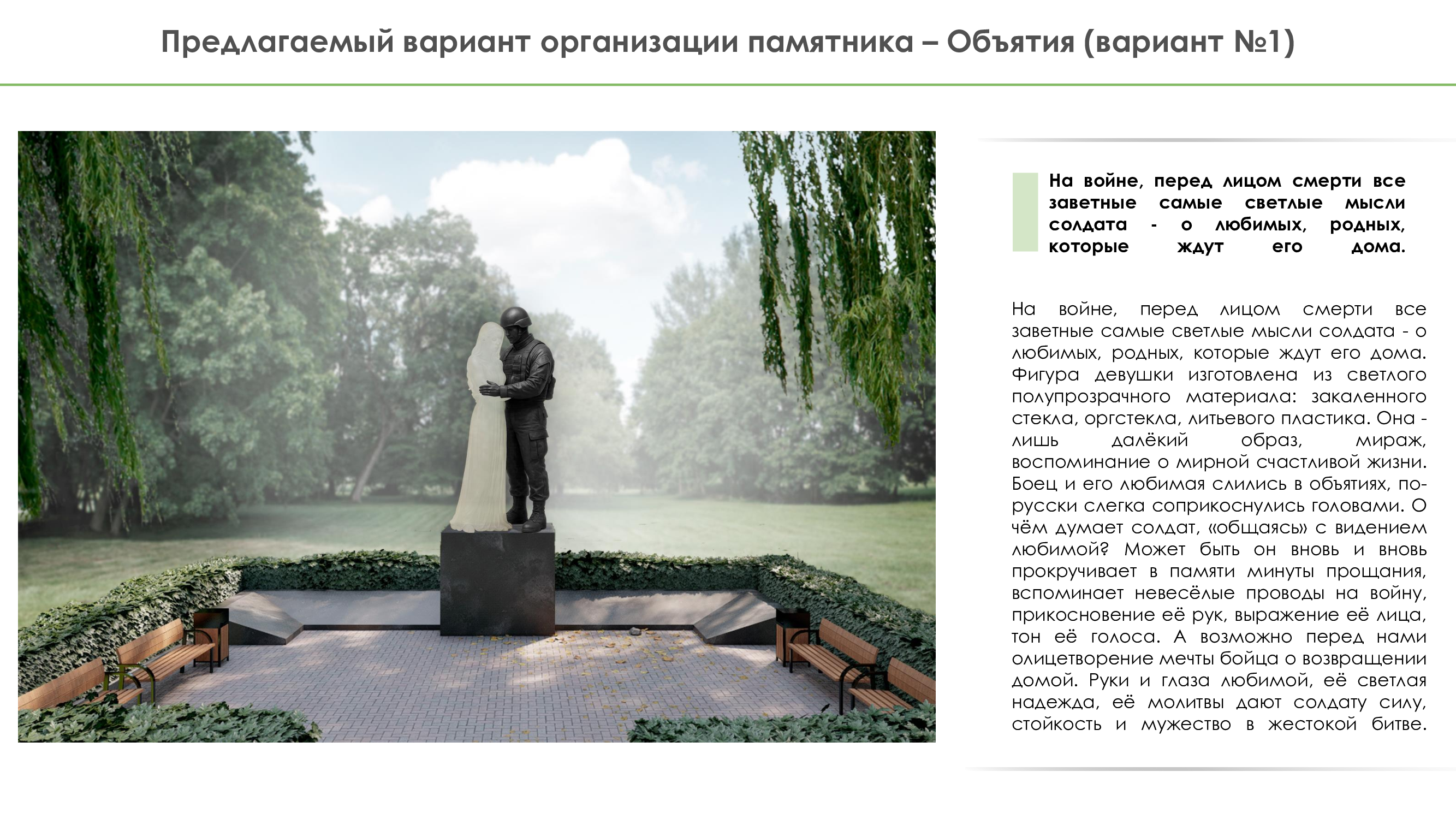 В процессе практики деятельность Ирины была многогранной. Одним из ключевых направлений стала разработка предложений по обустройству мемориальных зон и площадей в муниципалитетах. Это включало в себя детальный анализ существующих территорий, изучение их исторического и культурного контекста. Ирина не просто разрабатывала дизайн-концепции, но и занималась непосредственным проектированием скульптур для этих комплексов, что требовало глубоких знаний в композиции и художественном воплощении.