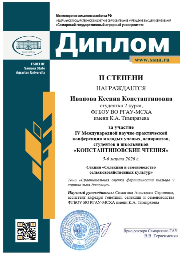 Студентки Российского государственного аграрного университета – МСХА имени К.А. Тимирязева Ксения Иванова и Динара Давлетшина успешно выступили на Всероссийской студенческой научной конференции «Константиновские чтения», которая состоялась на базе Самарского государственного аграрного университета. Их научная работа получила высокую оценку экспертного сообщества, принеся девушкам заслуженное второе место.