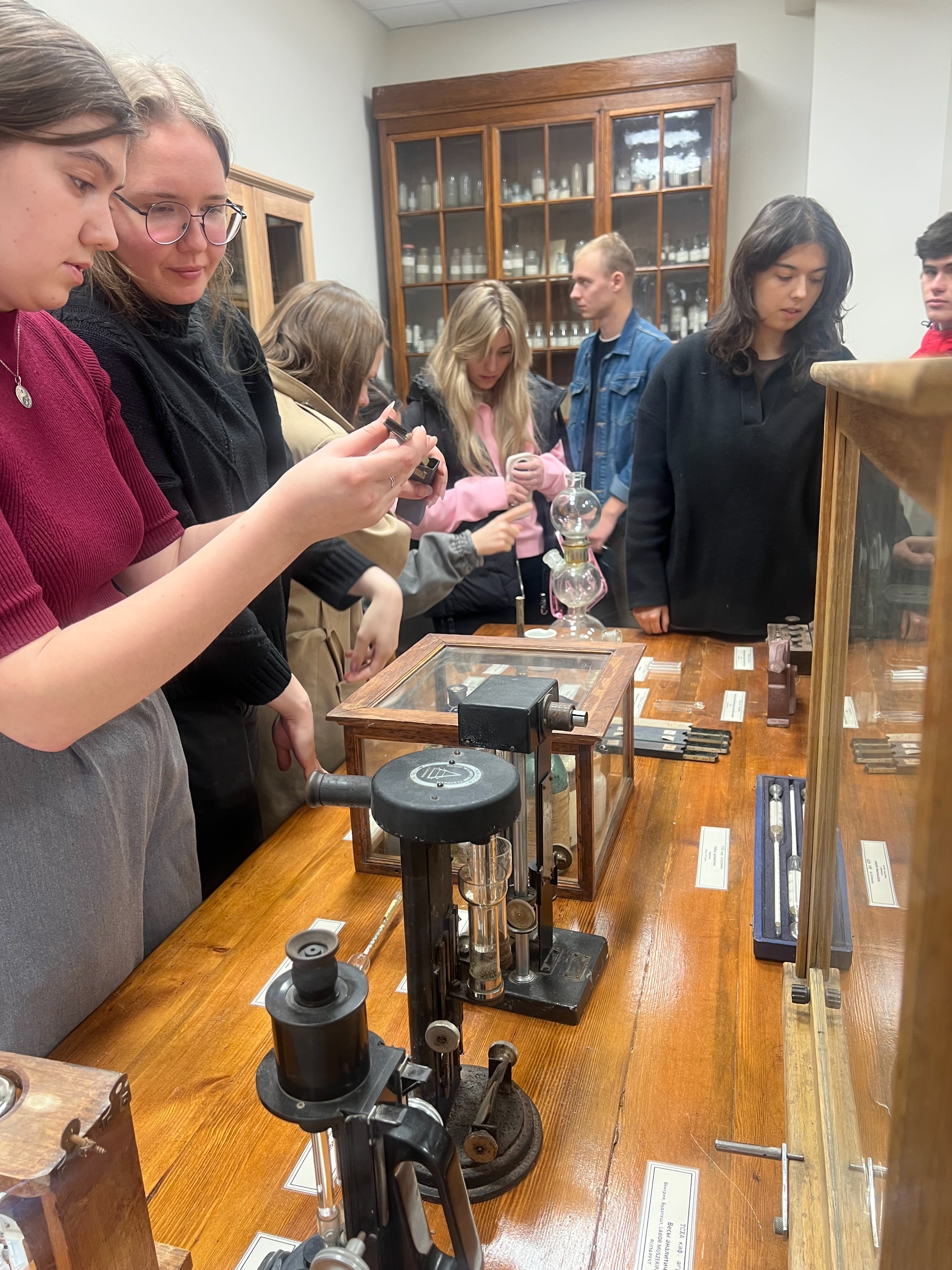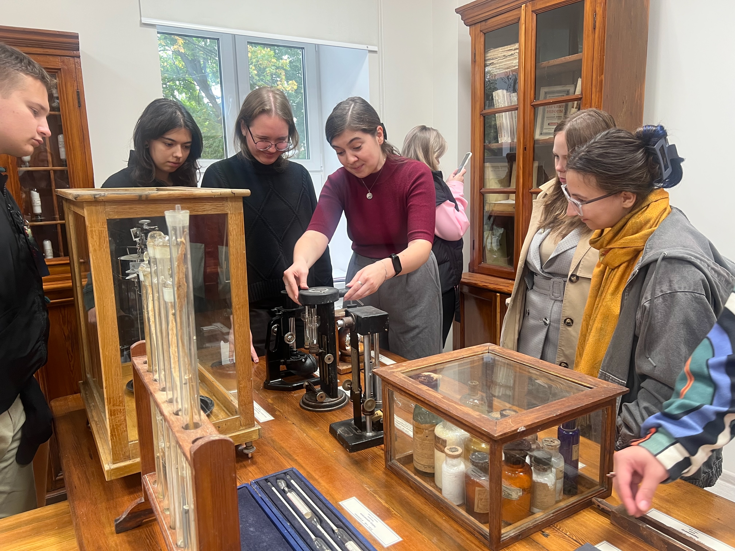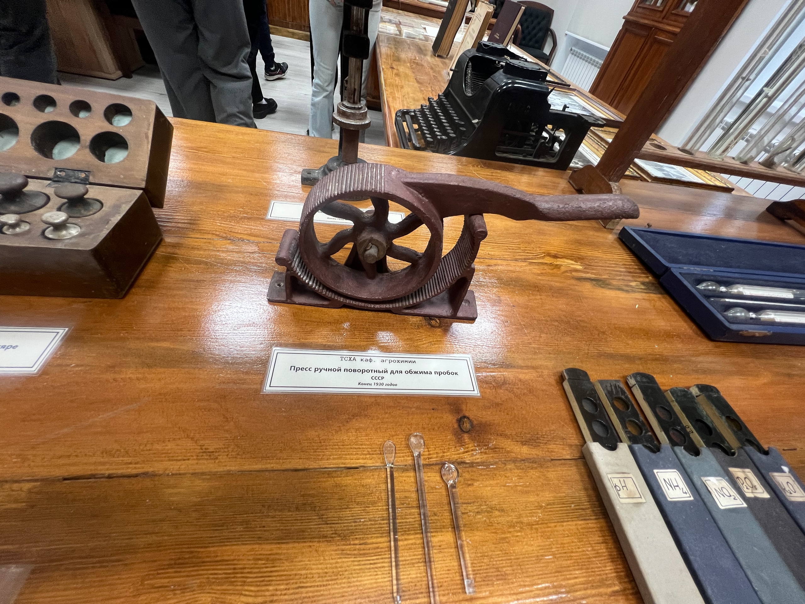 Кабинет-музей академика Д.Н. Прянишникова, основанный в 2015 году к 150-летнему юбилею ученого, представляет собой уникальное собрание подлинных экспонатов. Студенты смогли увидеть личный рабочий стол и кресло Дмитрия Николаевича, его обширную коллекцию удобрений и минералов-агроруд – сырья для производства минеральных туков. Особый интерес вызвали старинные приборы и оборудование: механический фотоколориметр, лабораторные весы, ртутные ареометры, а также подлинные химические реактивы марок «Ферейн» и «Кальбаум». Экспозиция дополнена многочисленными книгами, фотографиями, альбомами и научными публикациями, позволяющими глубже понять масштаб и значимость деятельности ученого.