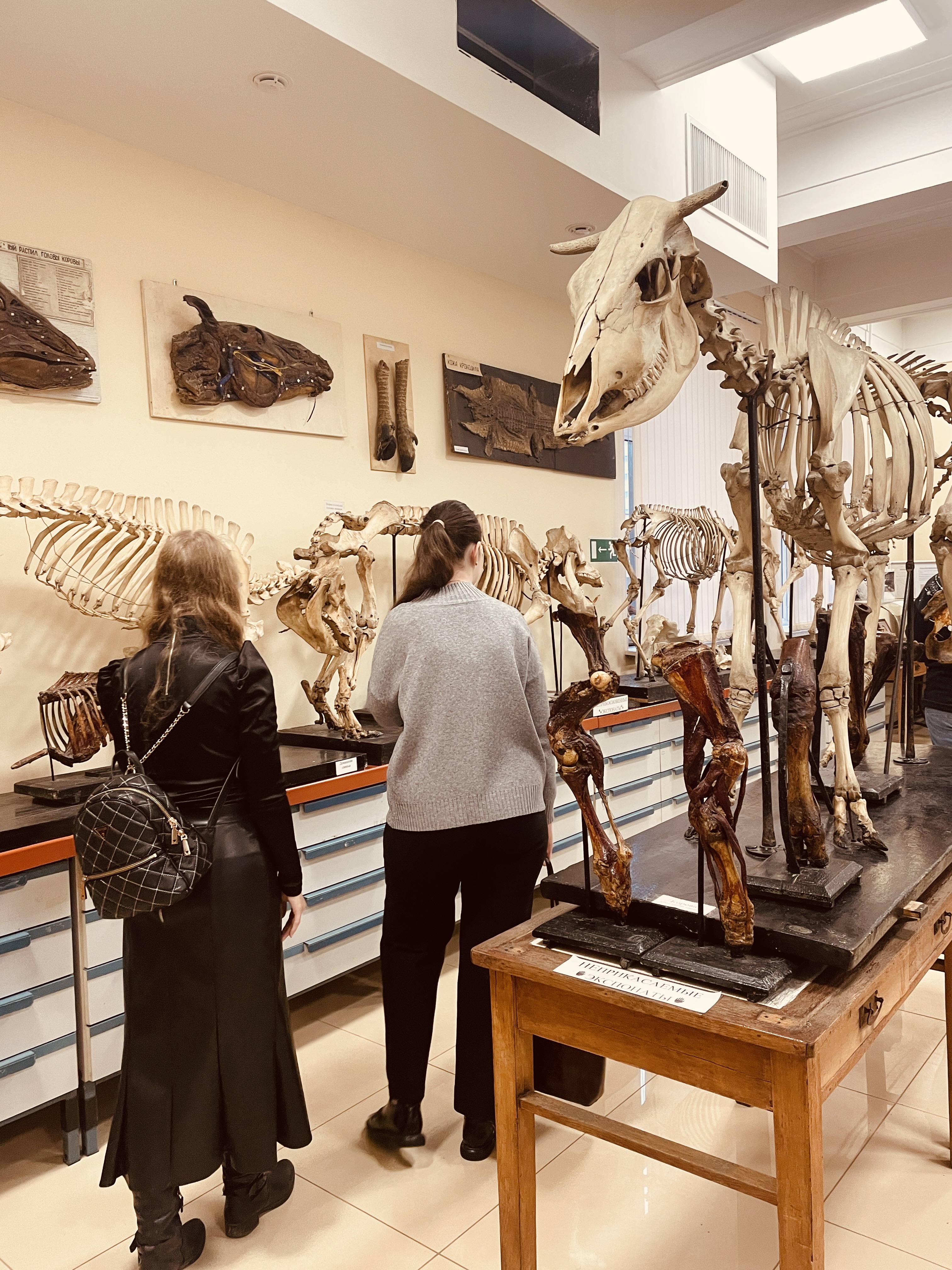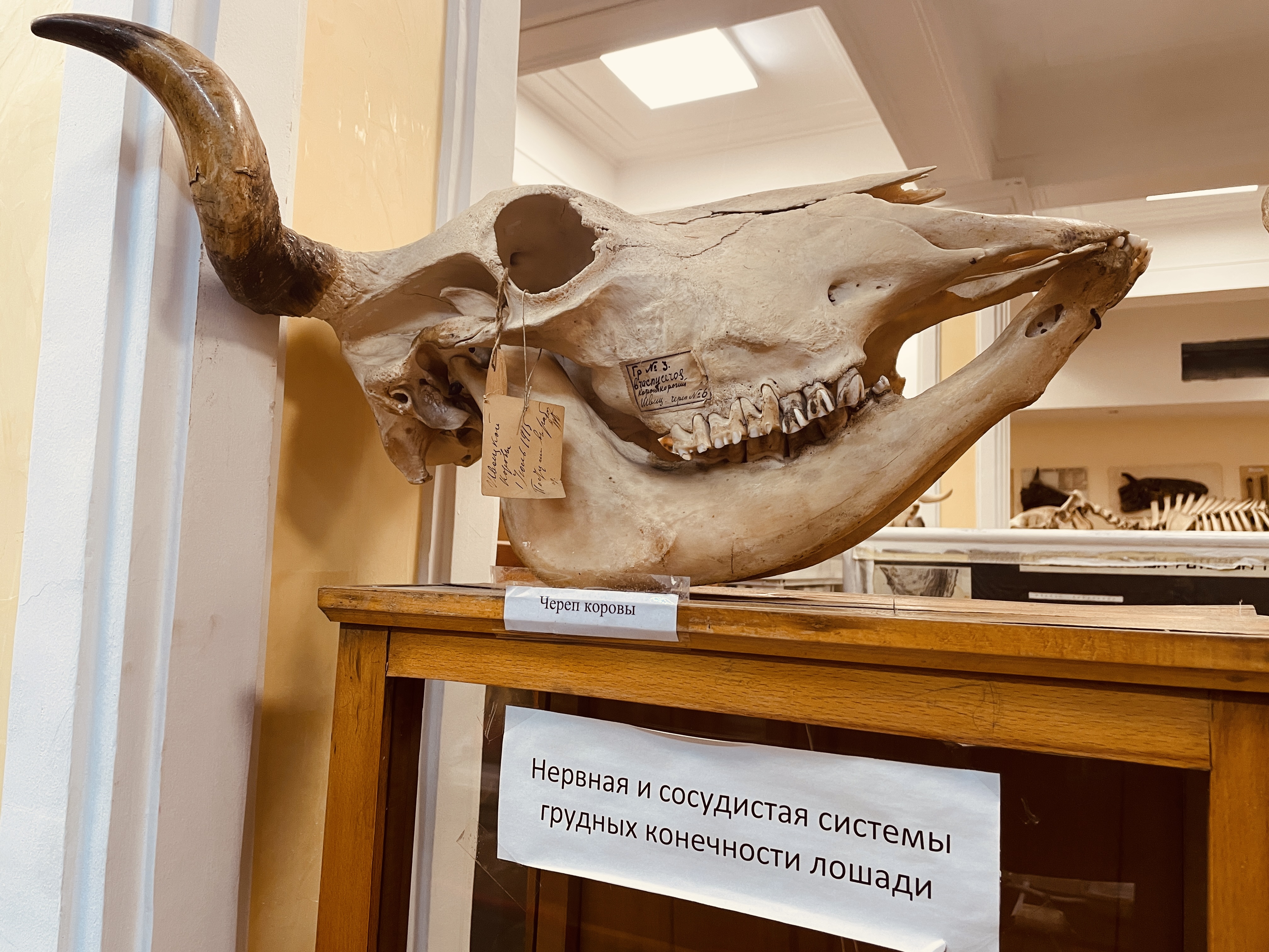 В музее представлены скелеты животных и человека, черепная коробка слона, законсервированные образцы эмбрионов животных, головного мозга и его сосудистая система, глазные яблоки и другие органы. Из рассказа экскурсовода ребята узнали, как происходит рост и обновление зубов жвачных животных, обсудили и другие анатомические особенности, представленных выставочных образцов.
