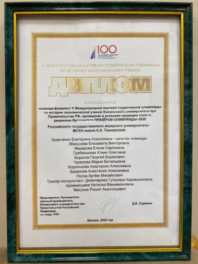По окончании оглашения результатов, команда Института экономики и управления АПК Российского государственного аграрного университета – МСХА имени К.А.Тимирязева была награждена Дипломом призера Олимпиады - 2020, а также объявлена благодарность всем участникам студенческой Олимпиады и тренерам-консультантам за высокий уровень подготовки и творческий подход.