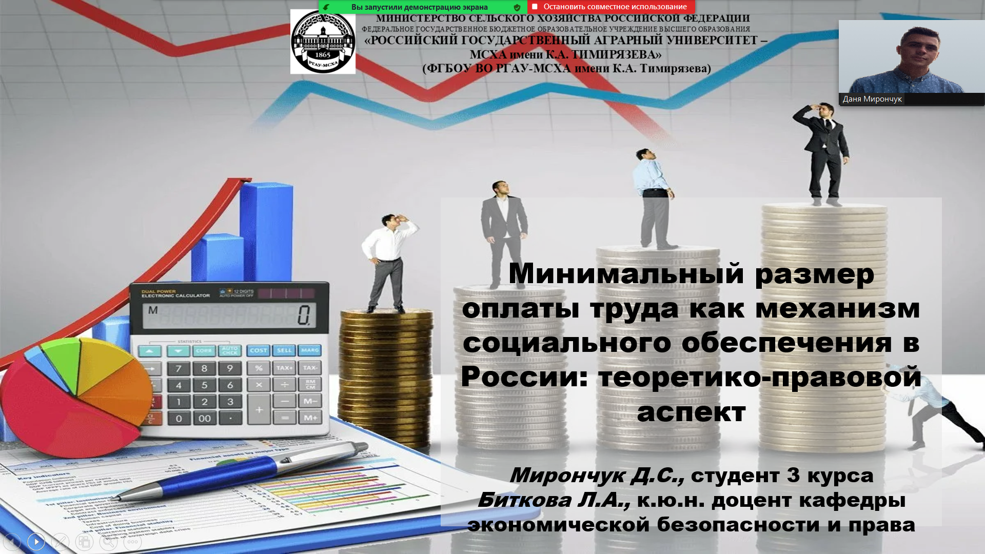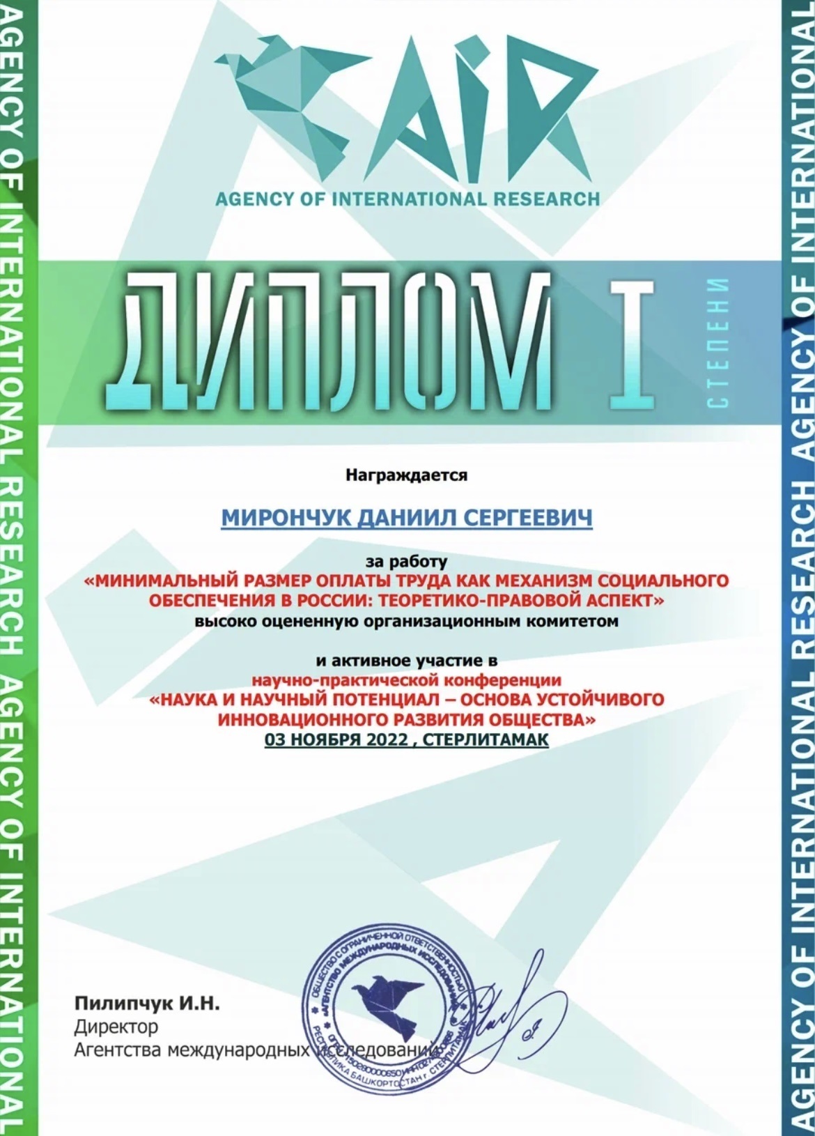 Его научную работу на тему: «Минимальный размер оплаты труда как механизм социального обеспечения в России: теоретико-правовой аспект», выполненную под научным руководством доцента кафедры экономической безопасности и права, к.ю.н., доцента Битковой Людмилы Алексеевны, высоко оценили члены жюри, отметив теоретическую и практическую значимость проведенного исследования.