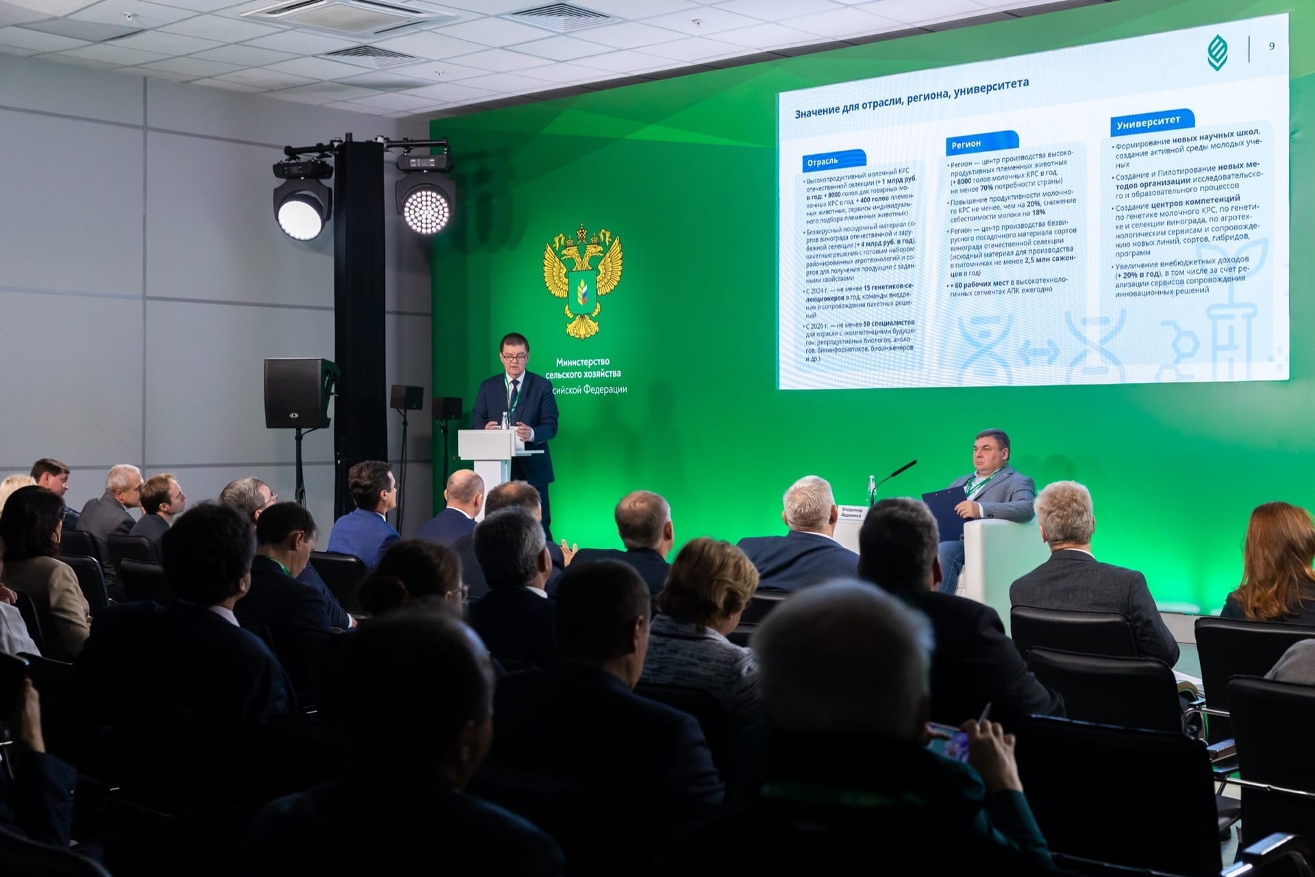 Вторым важным пунктом повестки дня было посещение круглого стола «Основные проблемы развития молодежной науки и пути их решения», организатором которого выступил Департамент научно-технологической политики и образования Минсельхоза России. В рамках круглого стола были рассмотрены основные проблемы, с которыми сталкиваются молодые ученые, а также пути их решения, опыт взаимодействия научного сообщества и руководства регионов.