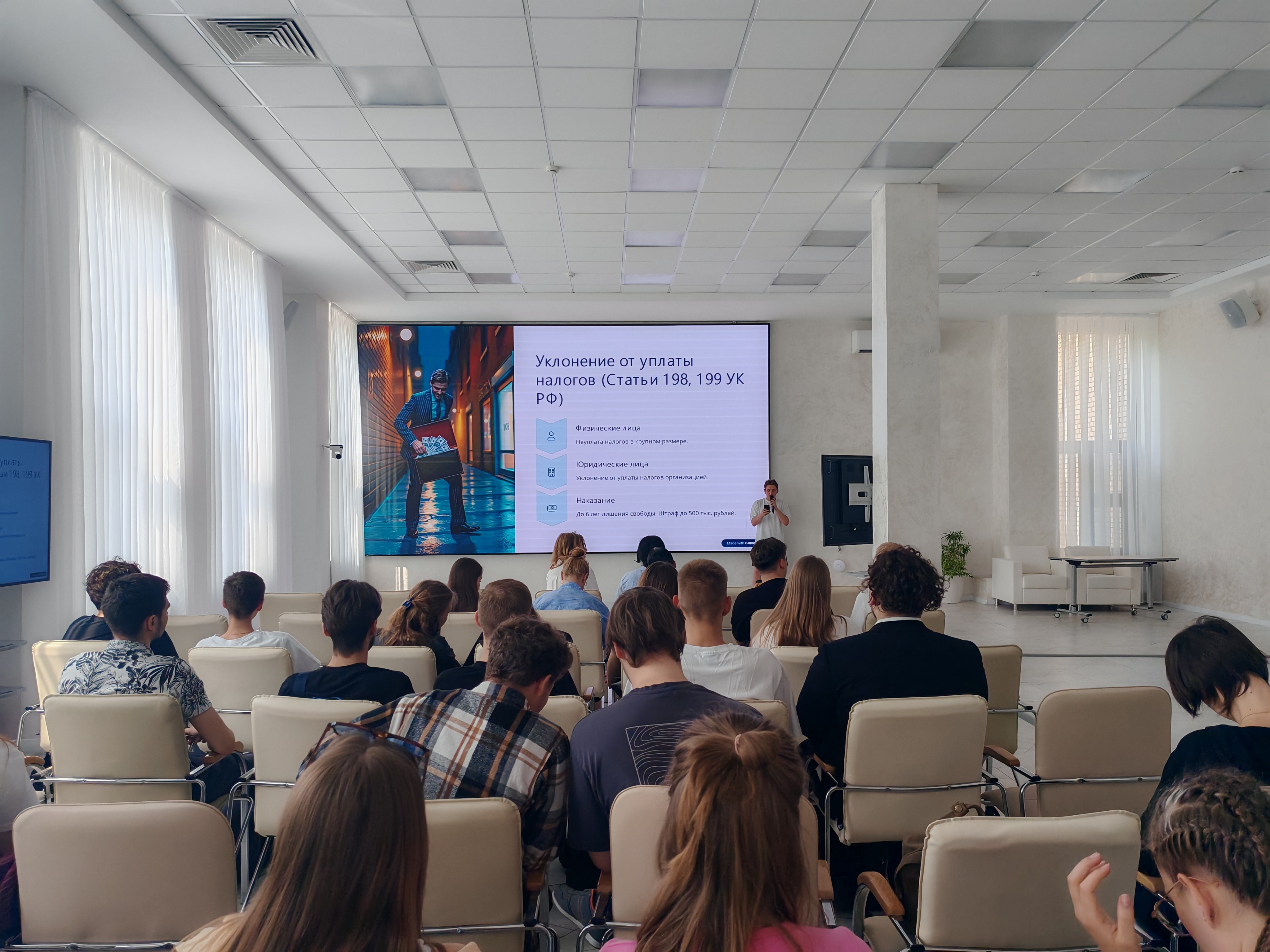 Арсен Артурович рассказал об особенностях расследования и поддержания обвинения по таким уголовным делам как уклонение физических лиц и организаций от уплаты налогов (ст. 198, 199 УК РФ), привел примеры таких уголовных дел с размерами ущерба, причиненного государству, рассказал об экономических и правовых последствиях для организаций, совершивших такие преступления.