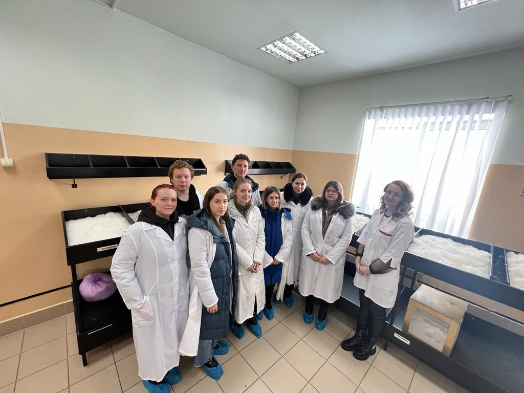 Особый интерес вызвало посещение основного производства по глубокой промышленной переработке перо-пухового сырья. Студенты подробно изучили этапы мойки, а также сортировки сырья на пуховую и перовую фракции. В цехе по набивке перо-пуховых изделий готовым наполнителем были получены знания о процессе набивки подушек, изготовления кассетных и стеганых пуховых одеял.