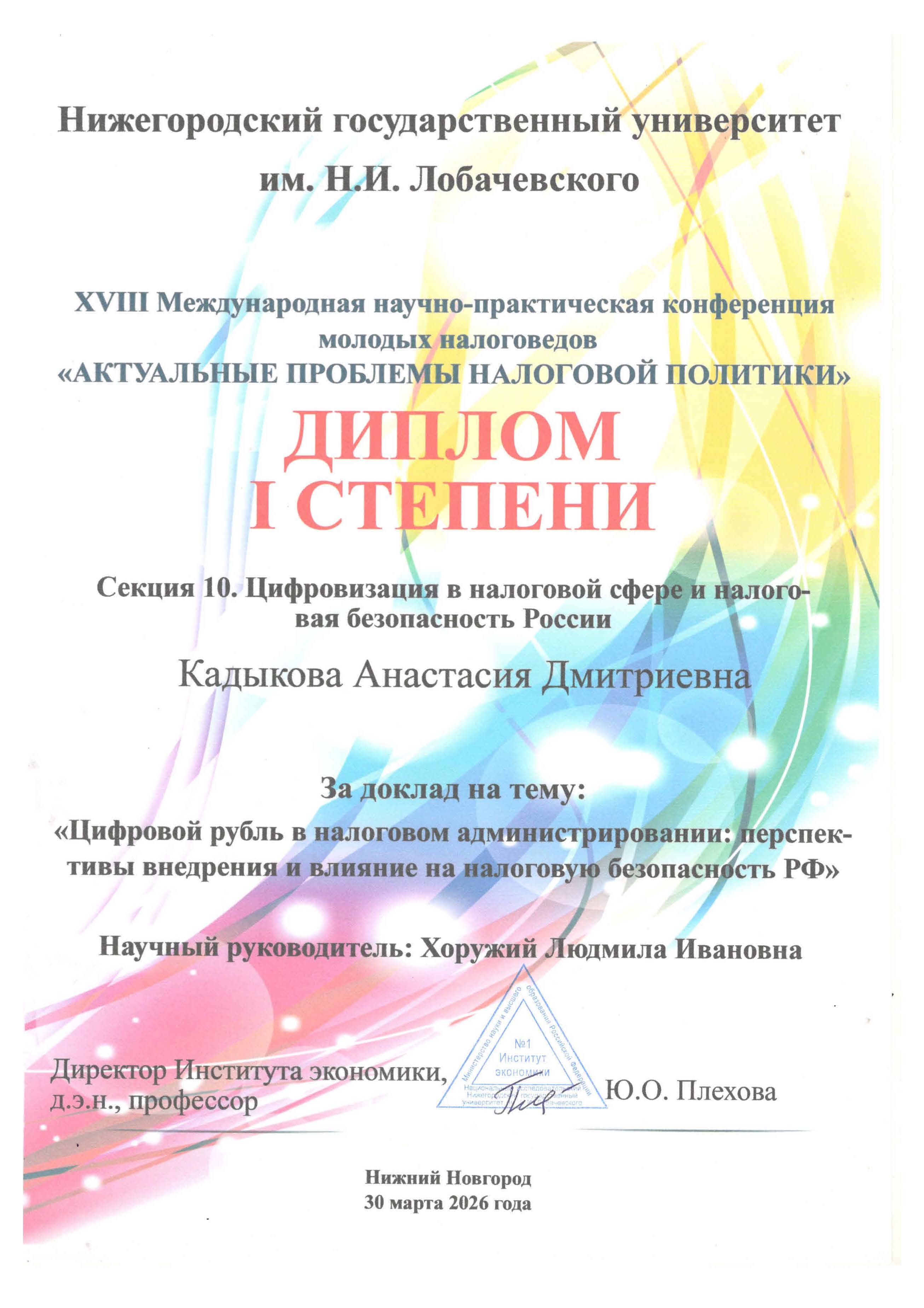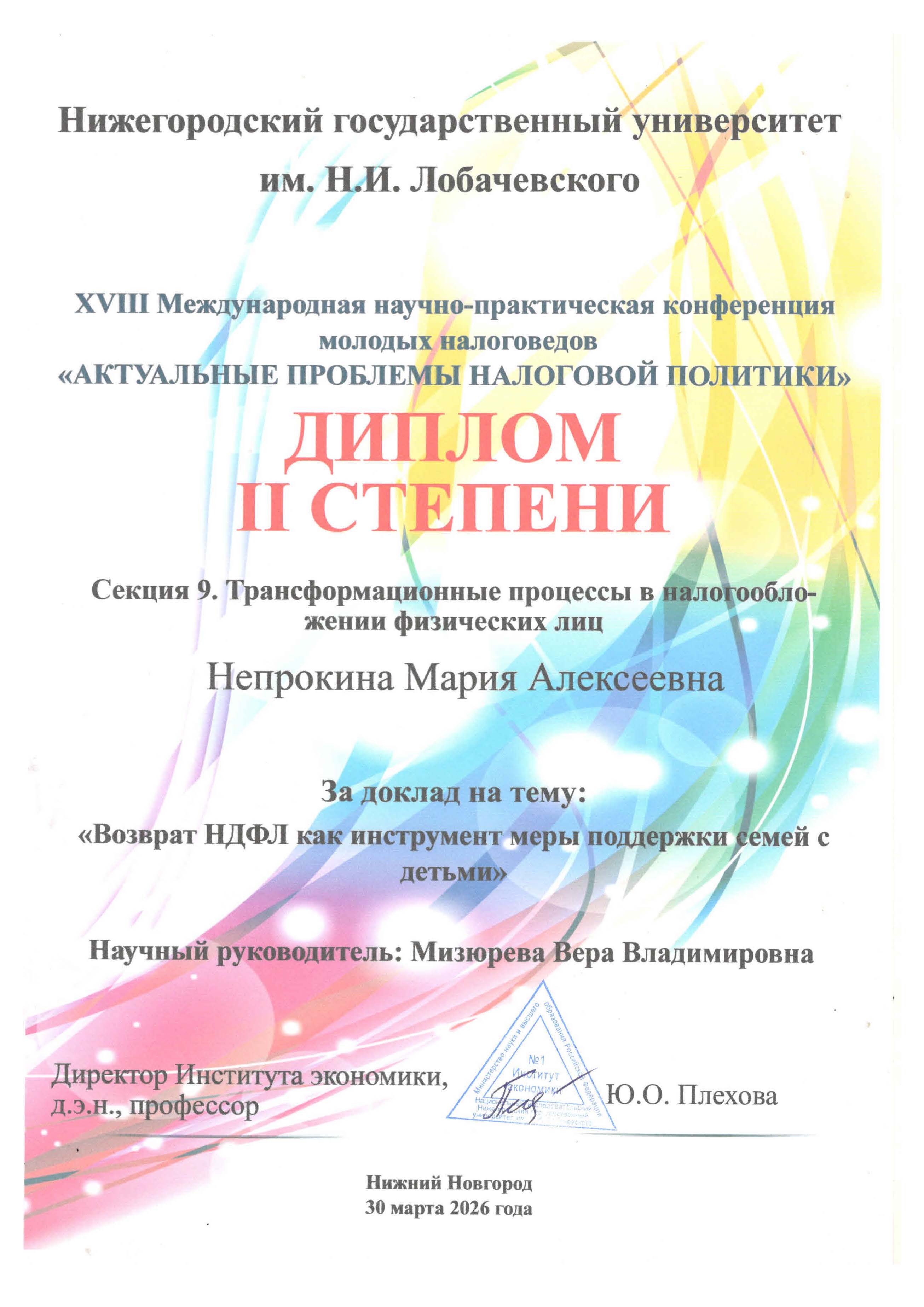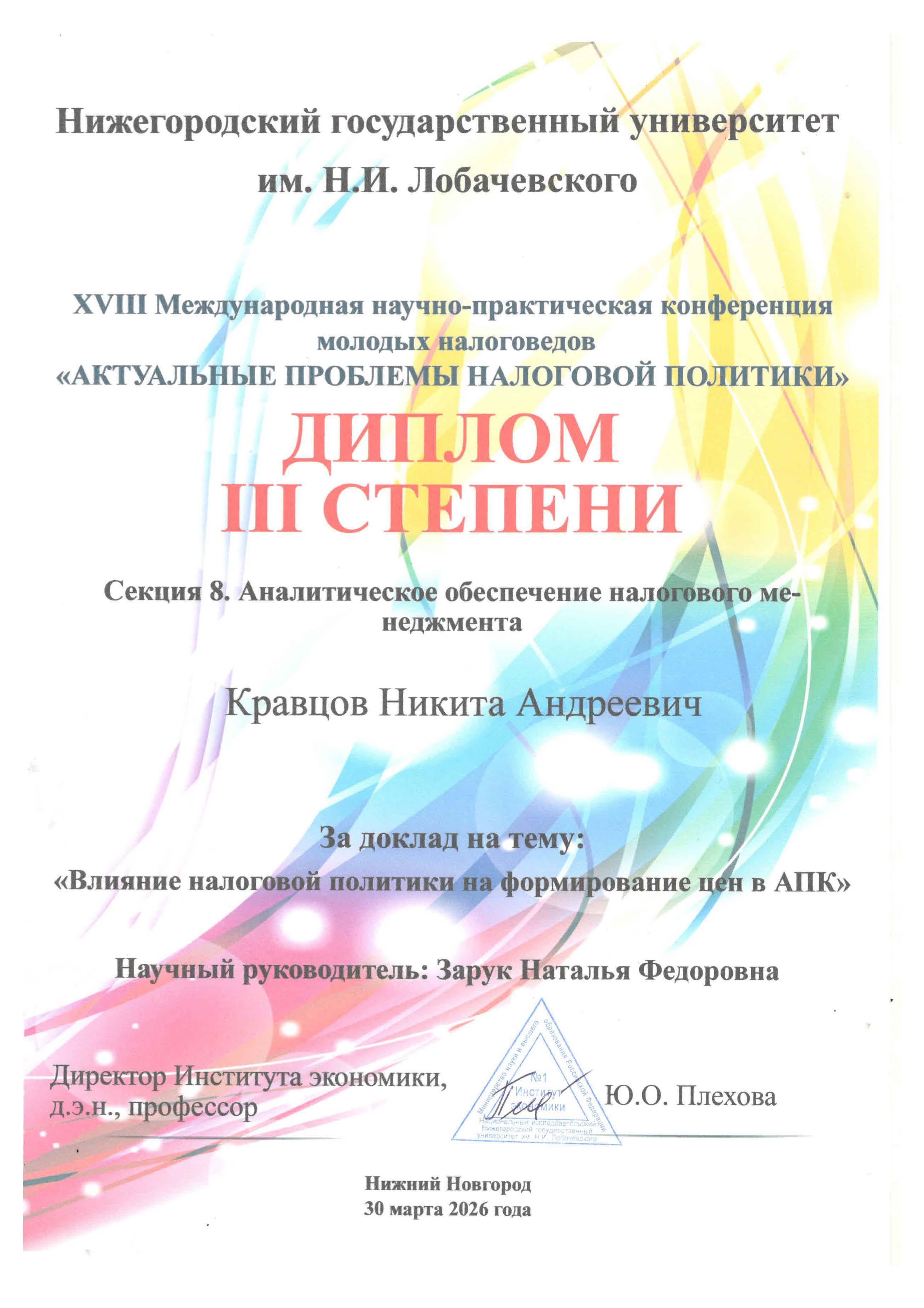 30 марта 2026 года на онлайн-площадке Нижегородского государственного университета имени Н.И. Лобачевского состоялась XVIII Международная научно-практическая конференция «Актуальные проблемы налоговой политики». Масштабный научный форум собрал 163 молодых исследователя из 11 ведущих вузов России и Беларуси, а студенты Института экономики и управления РГАУ-МСХА имени К.А. Тимирязева не только достойно представили родную alma mater, но и вошли в число призеров.