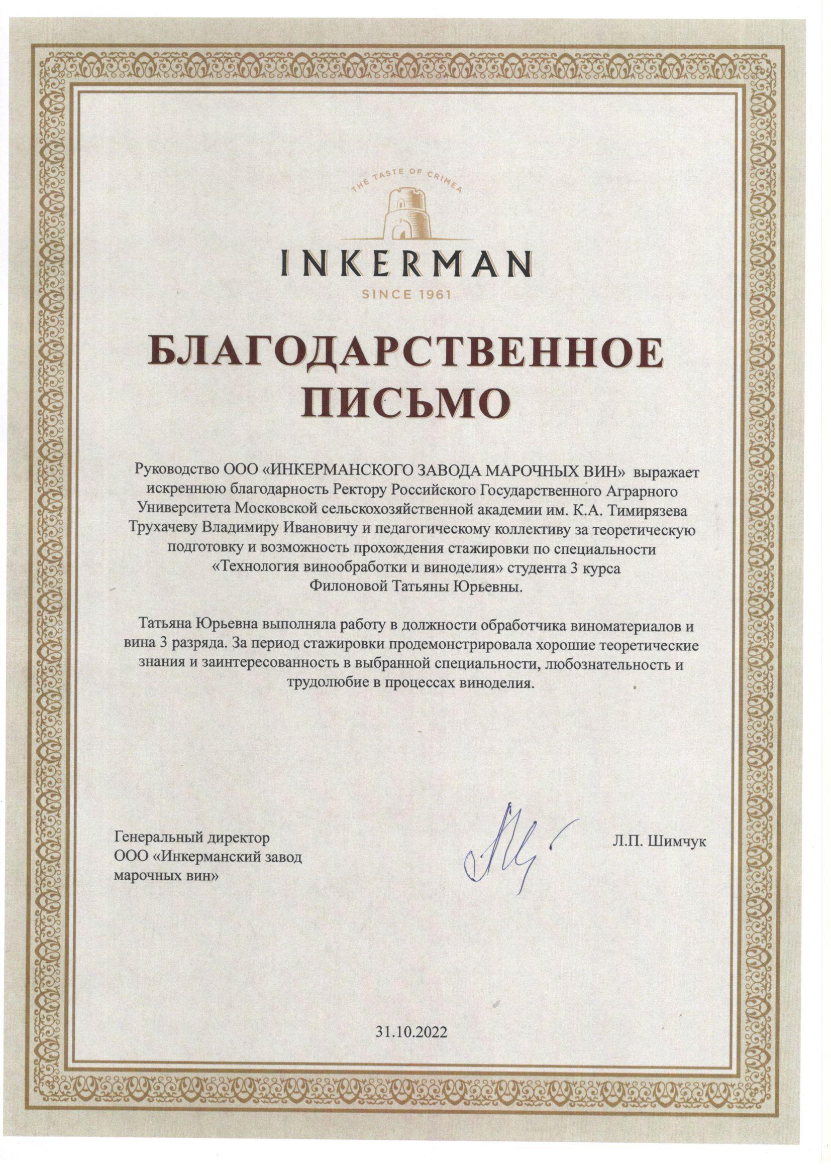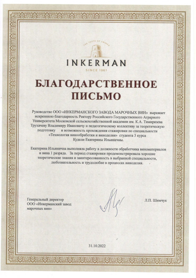 Одним из предприятий, традиционно являющихся базой для прохождения практик студентов 3 курса Технологического института, является ООО «Инкерманский завод марочных вин», расположенный в Республике Крым, г. Севастополь. Являясь одним из флагманов винодельческой промышленности, он предоставил возможность для практической подготовки студентов Технологического института Филоновой Татьяны Юрьевны и Куделя Екатерины Ильиничны. Осваивая современные технологии винодельческого производства, они проявили большой интерес к выбранной специальности, продемонстрировали высокий уровень знаний и умений, полученный в процессе обучения. За добросовестный труд во время практики Т.Ю. Филонова и Е.И. Куделя были награждены благодарственными письмами от администрации предприятия.