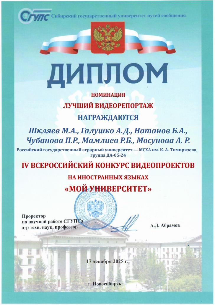 Студенты Института агробиотехнологии РГАУ-МСХА имени К.А. Тимирязева второй год подряд успешно представляют наш университет на Всероссийском конкурсе видеопроектов «Мой университет», который проводится ФГБОУ ВО «Сибирский государственный университет путей сообщения» в Новосибирске. Их творчество, глубина подачи материала и умение работать в команде вновь получили высокую оценку организаторов и членов жюри этого престижного конкурса.