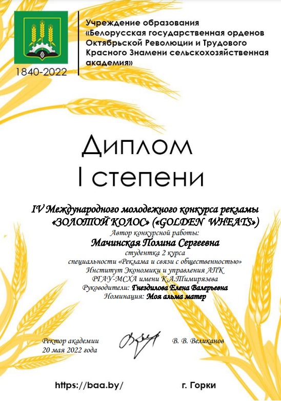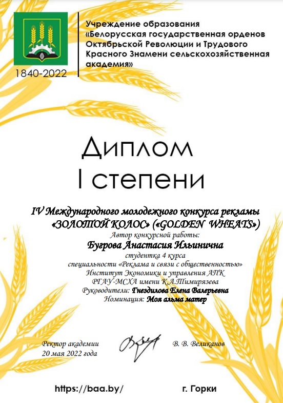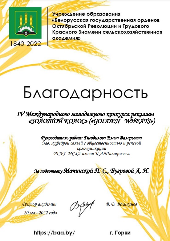 Студенты кафедры связей с общественностью и речевой коммуникации Института экономики и управления АПК Анастасия Бугрова и Полина Мачинская стали дипломантами I степени Международного конкурса рекламы "Золотой колос", который проводился Белорусской государственной сельскохозяйственной академии.
