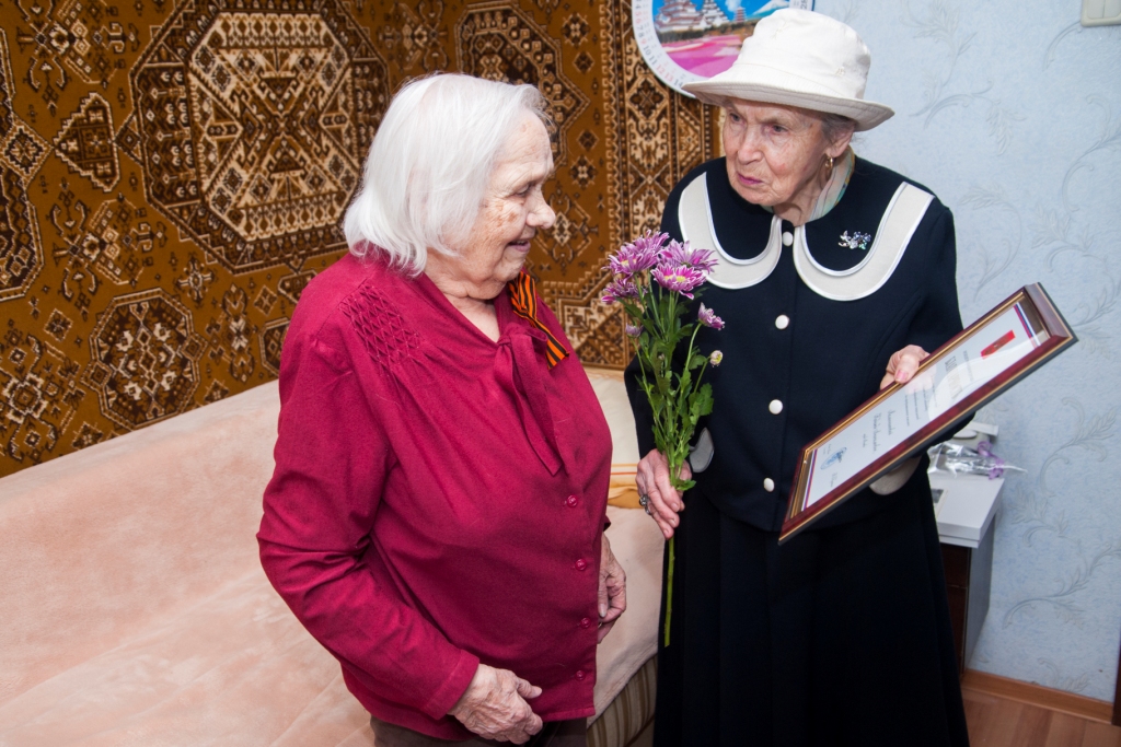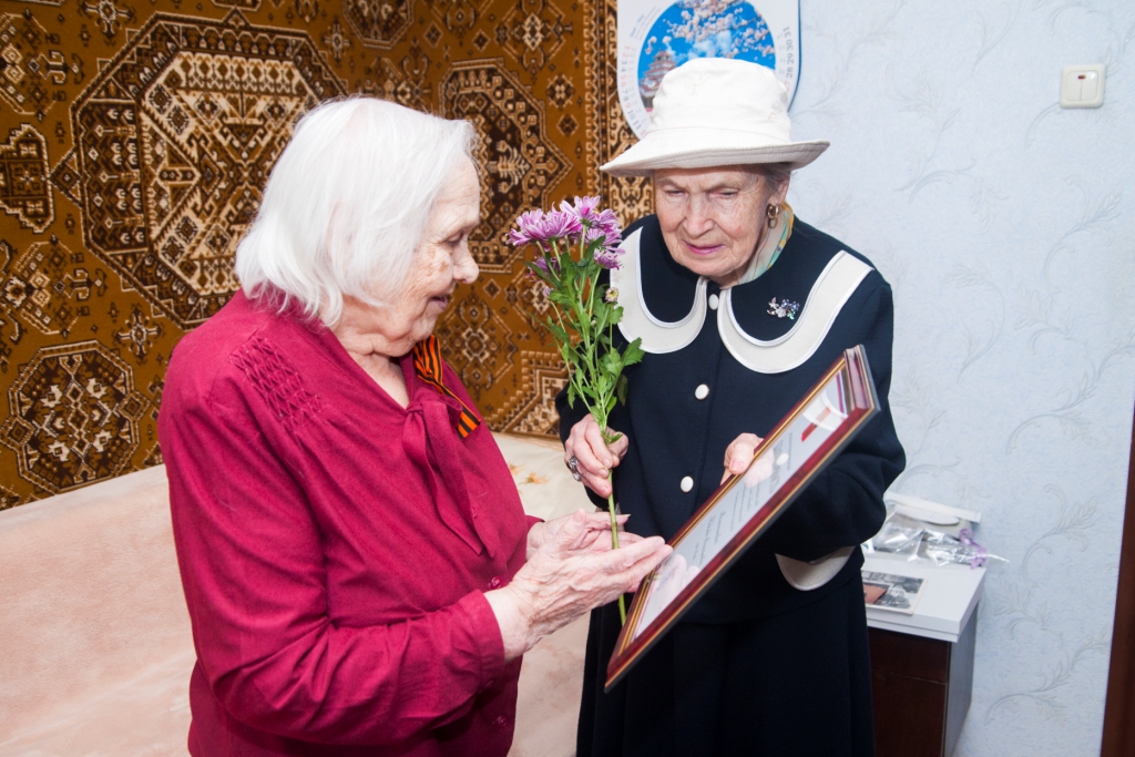 Евгения Большакова и Оксана Чебанова поздравили Надежду Анисимовну с наступающим Днем Победы, пожелали здоровья, долгих лет жизни и подарили ценный подарок. Надежда Анисимовна была приятно тронута вниманием и пригласила гостей на чай с облепиховым вареньем, кстати, собственного производства.