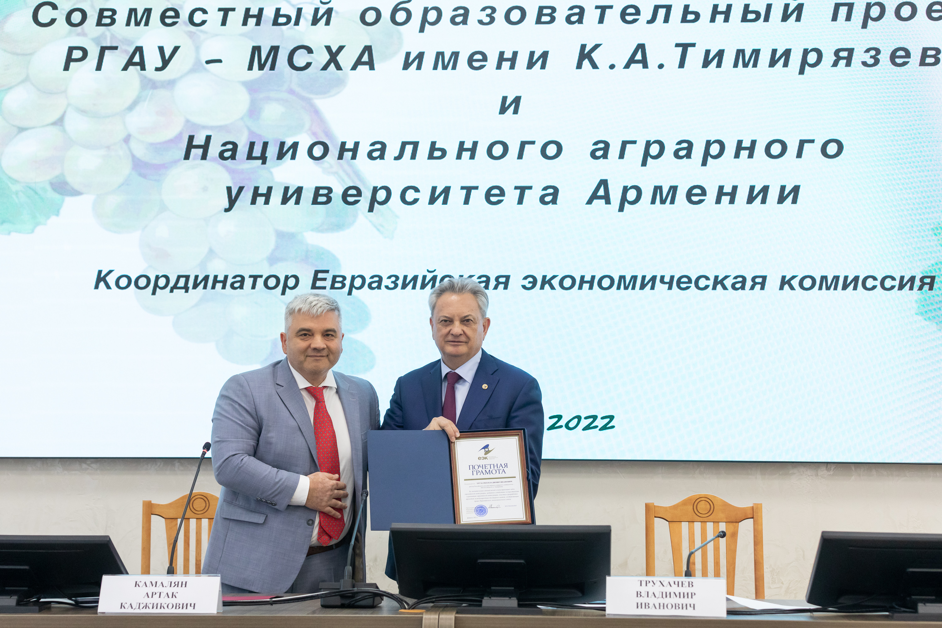 Почетным гостем события стал министр по промышленности и агропромышленному комплексу Евразийской экономической комиссии Артак Каджикович Камалян. Он подчеркнул, что совместный образовательный курс Тимирязевской академии и Национального аграрного университета Армении стал практическим результатом реализации Меморандума по развитию взаимодействия государств ЕЭС в сфере подготовки кадров для промышленности и агропромышленного комплекса. Документ был подписан в конце прошлого года органами исполнительной власти в области образования и сельского хозяйства стран Союза и дал новый импульс для развития межгосударственного межвузовского сотрудничества.
