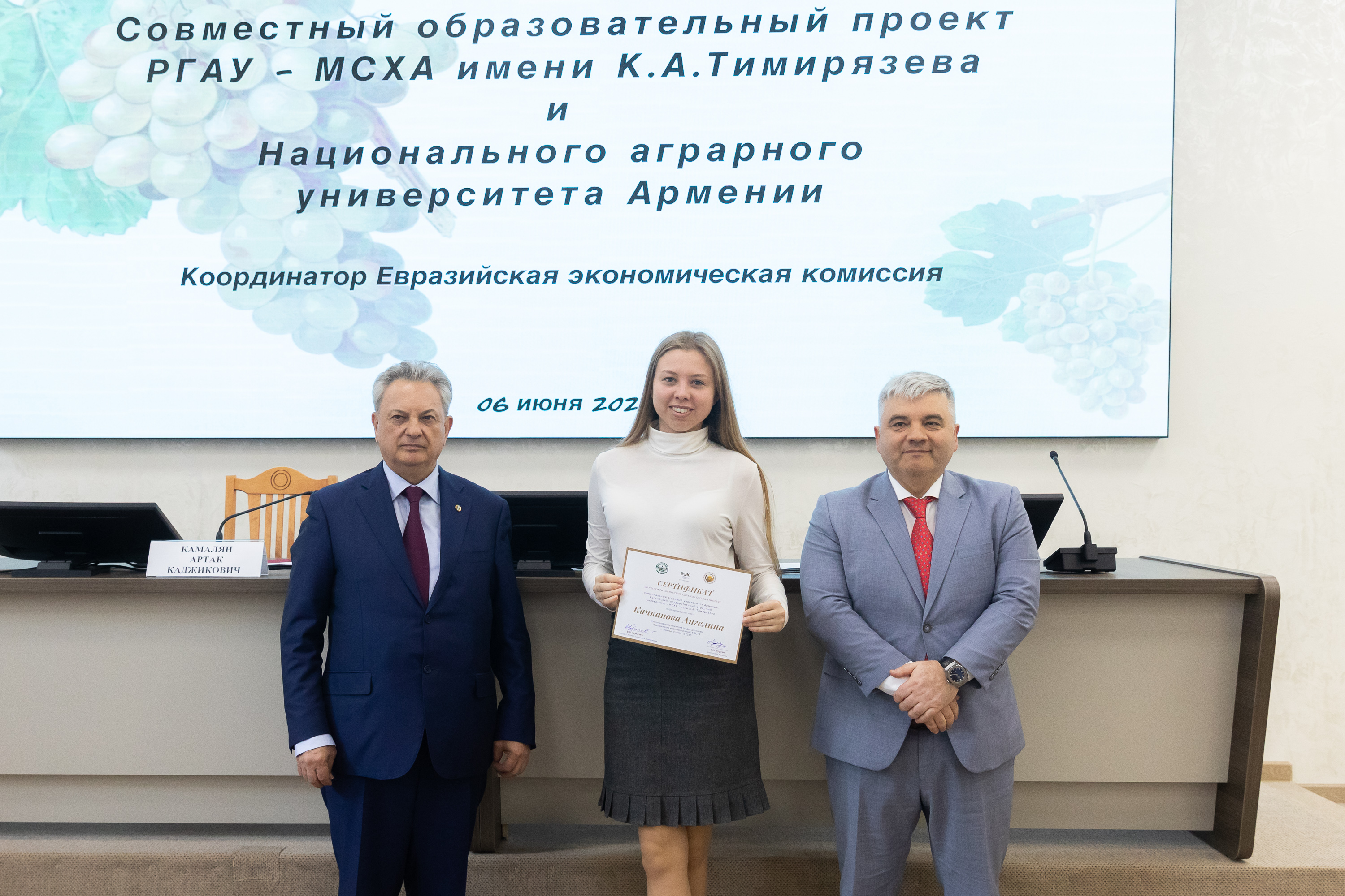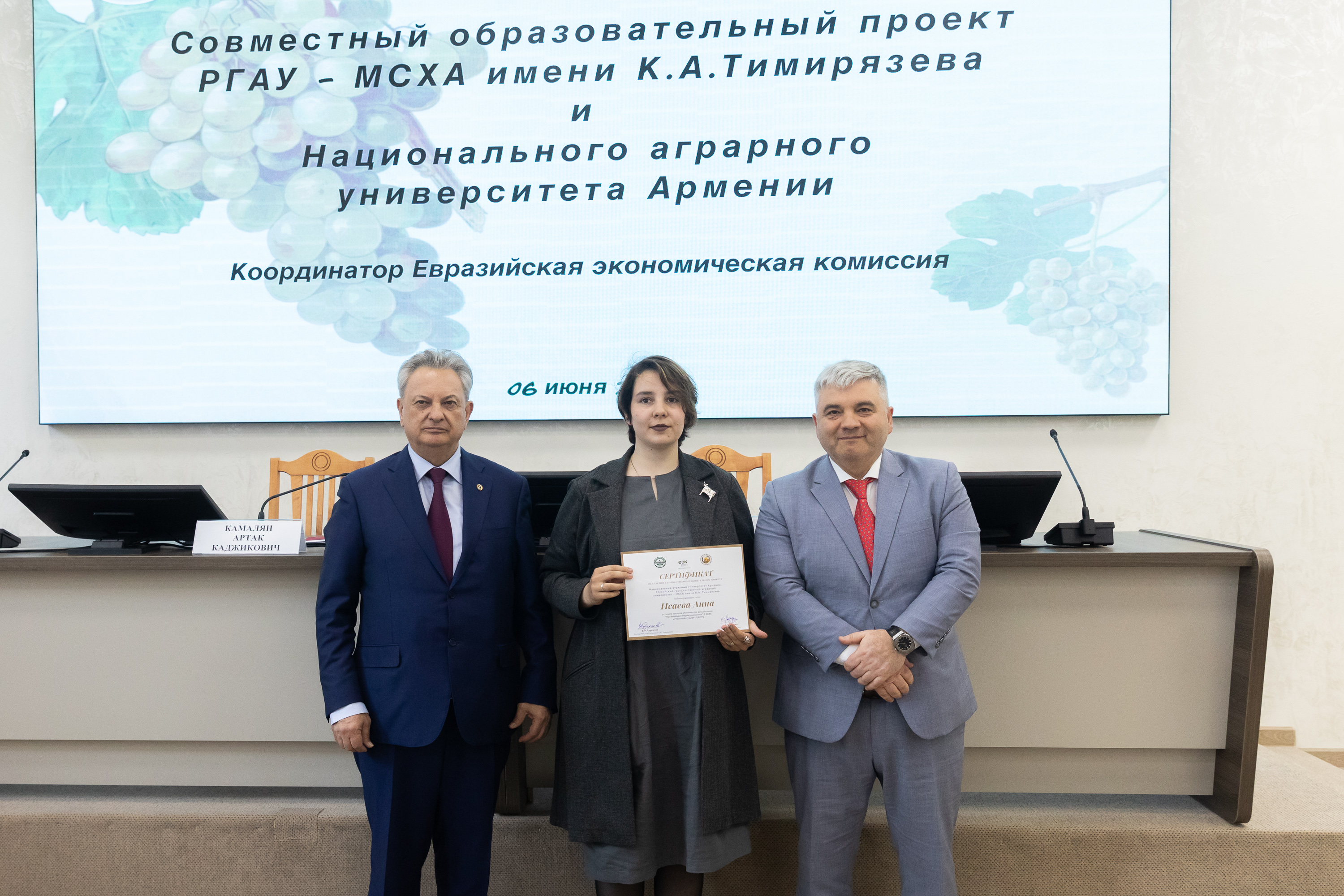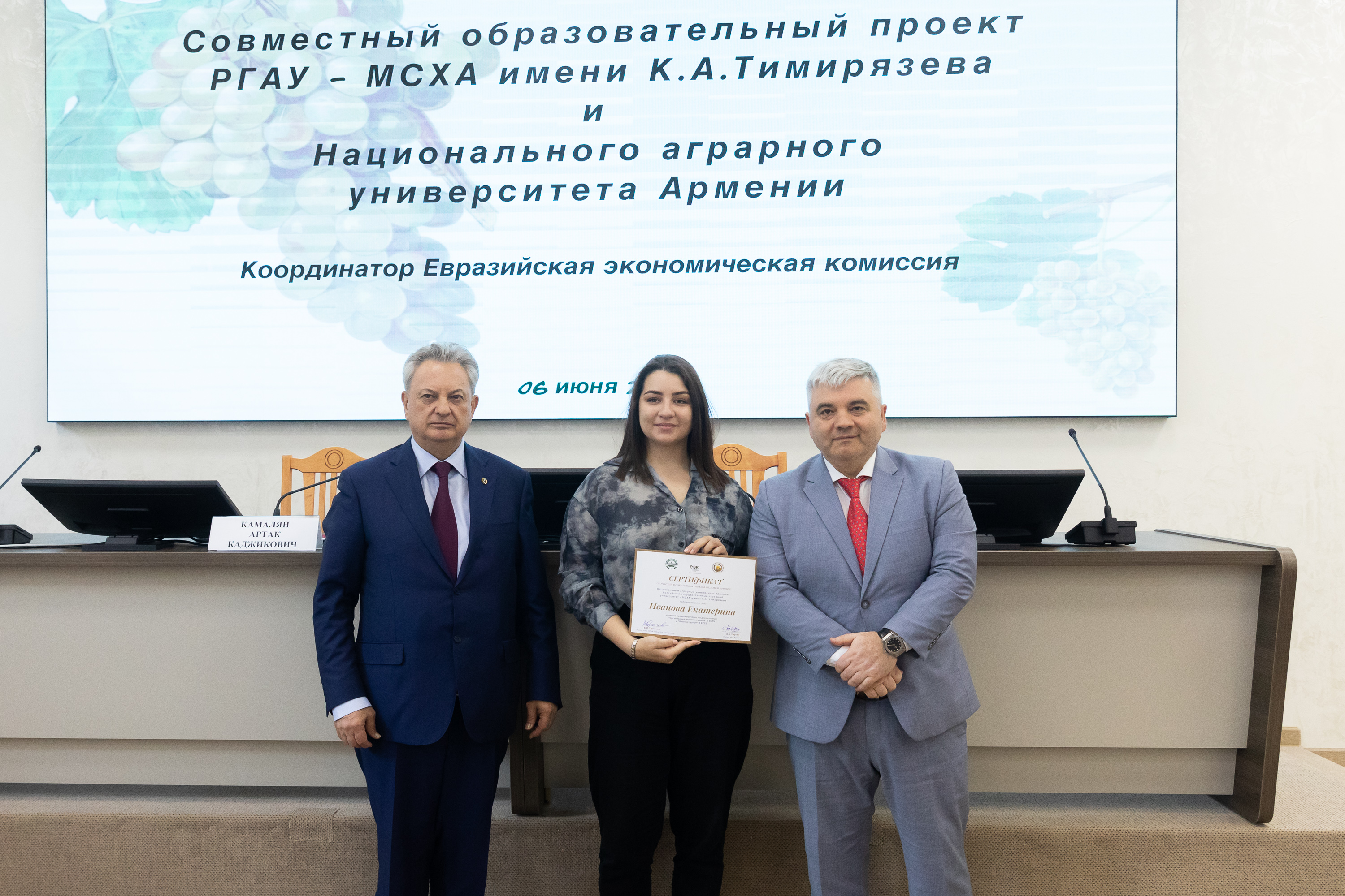 В Тимирязевской академии и Национальном аграрном университете Армении состоялась торжественная церемония вручения сертификатов по итогам совместного курса по виноделию. Участников образовательной программы поздравили ректор РГАУ-МСХА, Академик РАН, профессор В.И. Трухачев, министр по промышленности и агропромышленному комплексу ЕЭК А.К. Камалян и проректор по международным связям и образовательным реформам НАУ Армении М.С. Мовсисян.