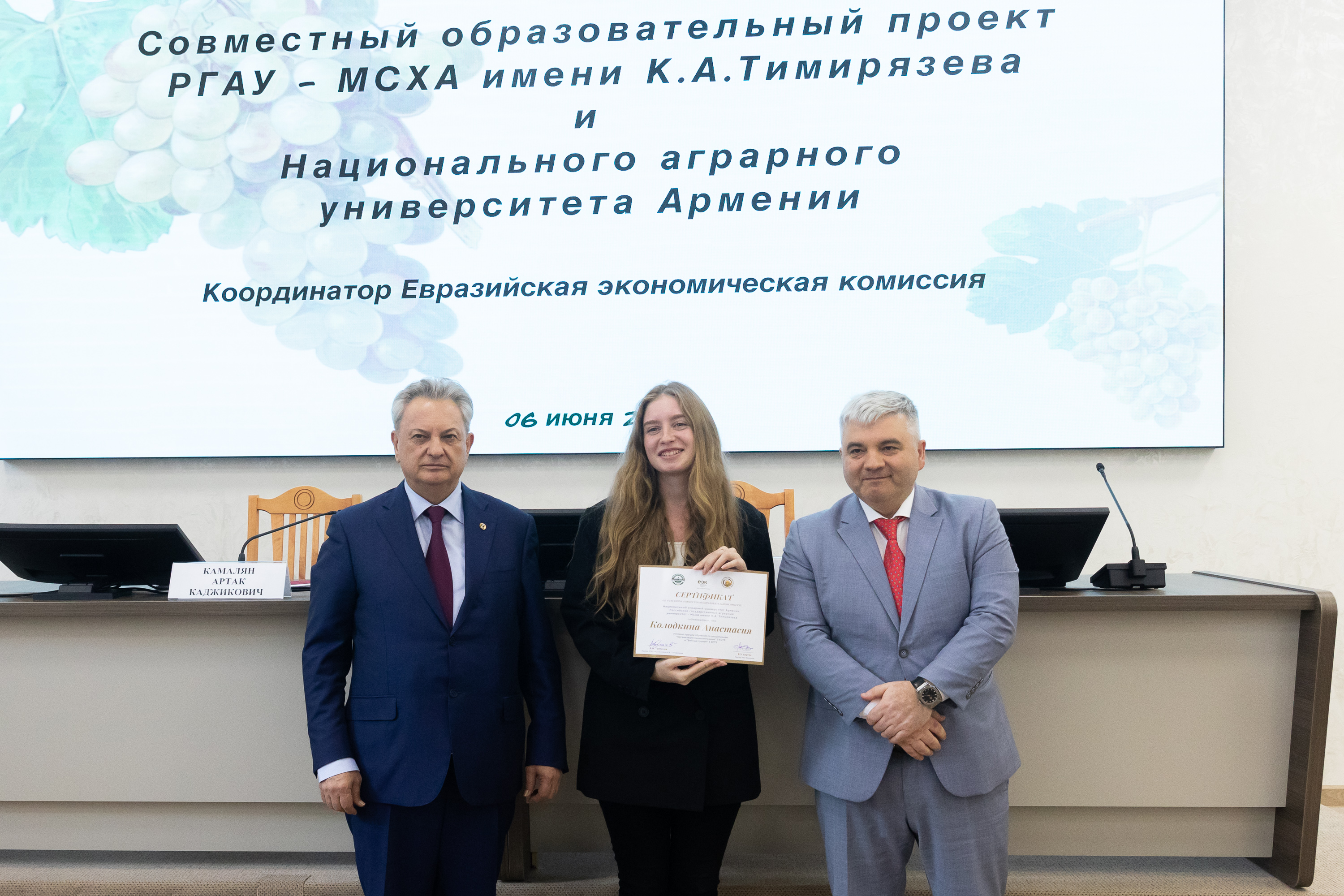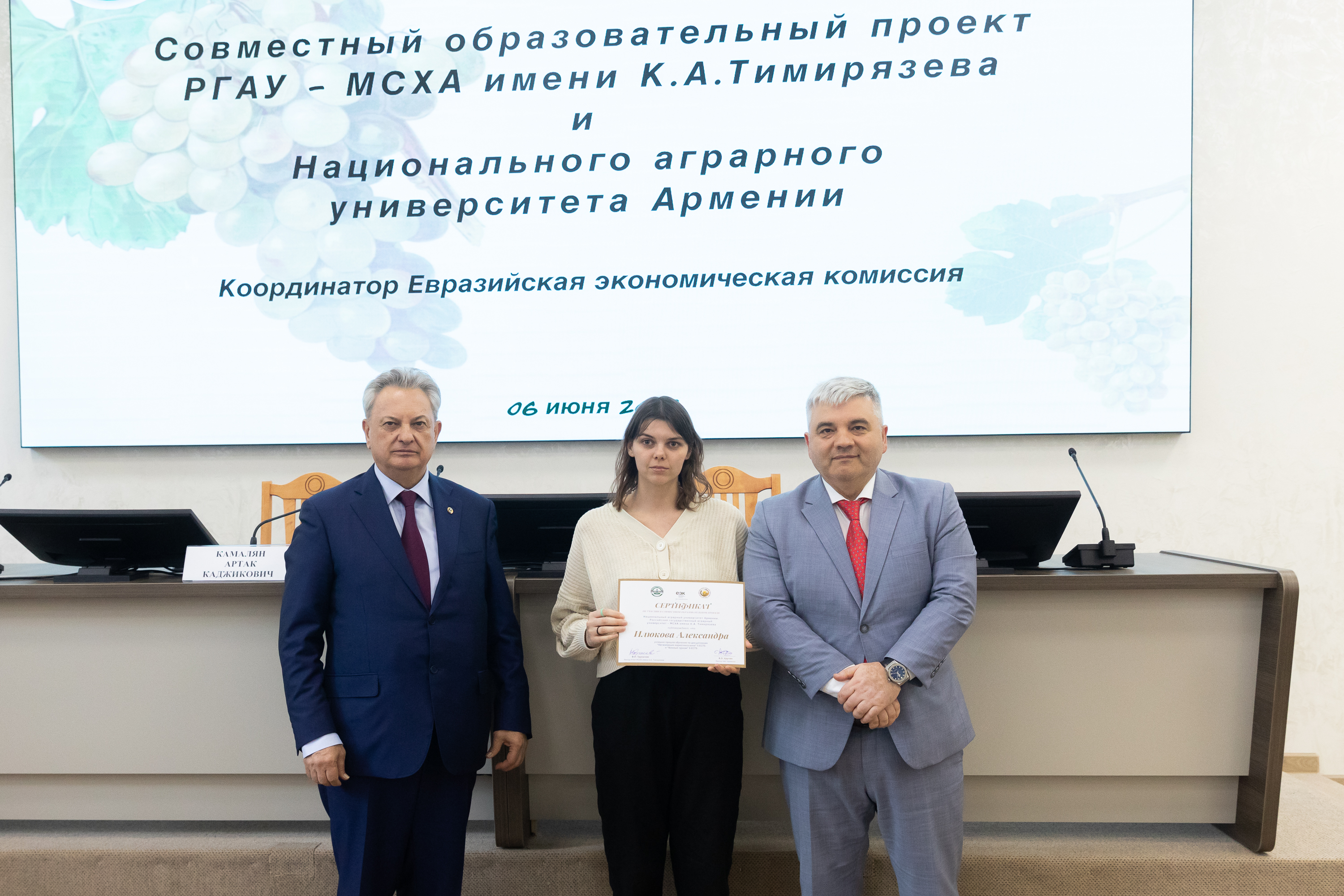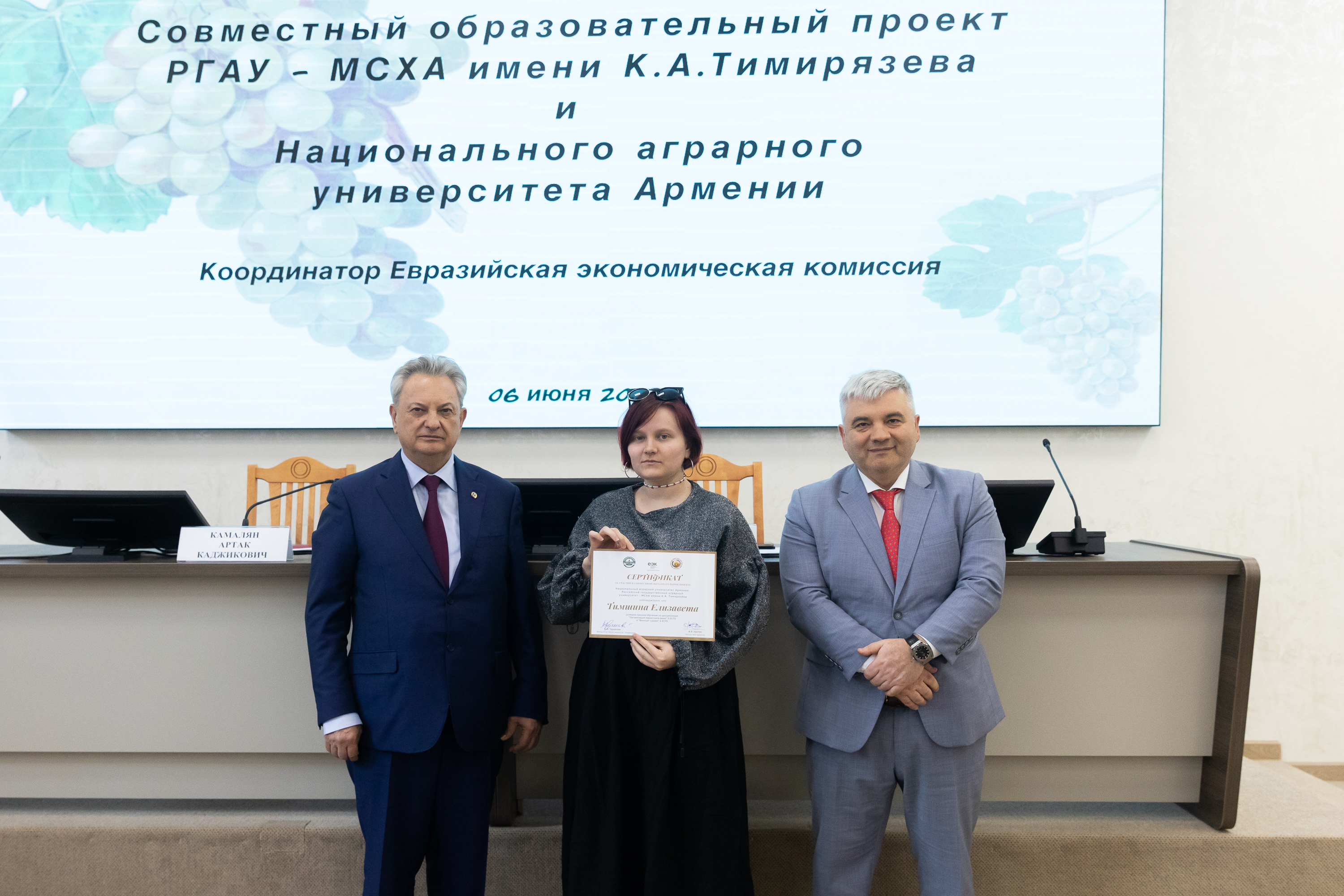 В Тимирязевской академии и Национальном аграрном университете Армении состоялась торжественная церемония вручения сертификатов по итогам совместного курса по виноделию. Участников образовательной программы поздравили ректор РГАУ-МСХА, Академик РАН, профессор В.И. Трухачев, министр по промышленности и агропромышленному комплексу ЕЭК А.К. Камалян и проректор по международным связям и образовательным реформам НАУ Армении М.С. Мовсисян.