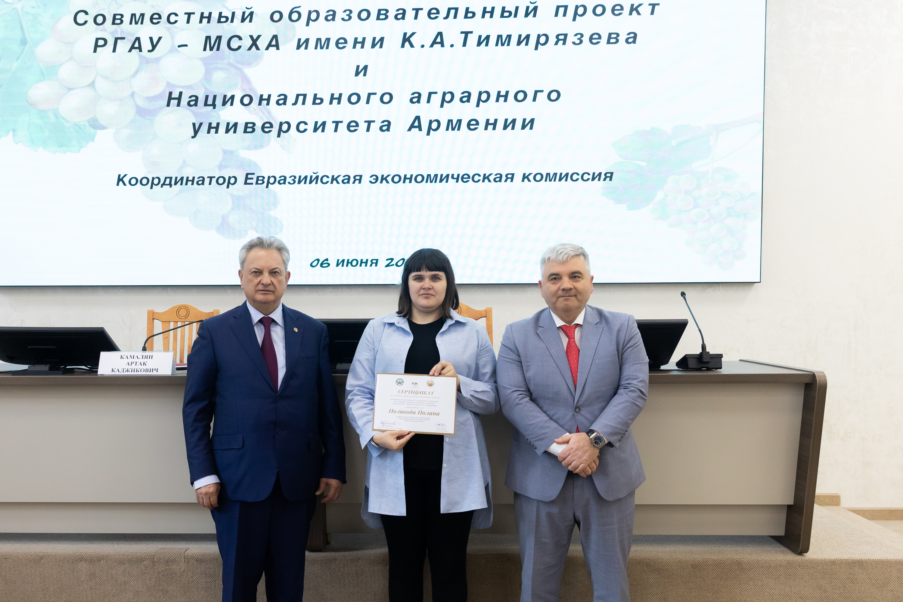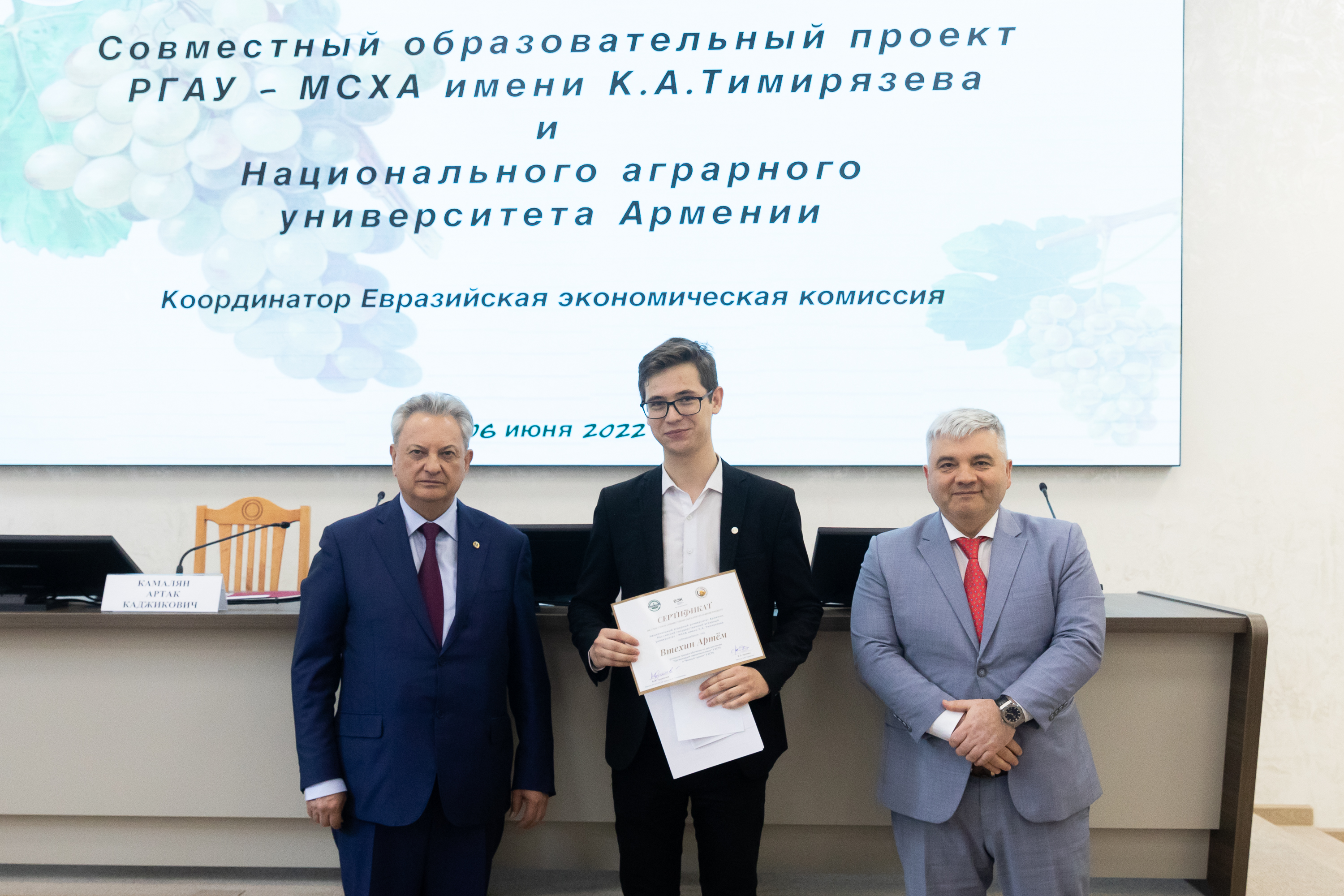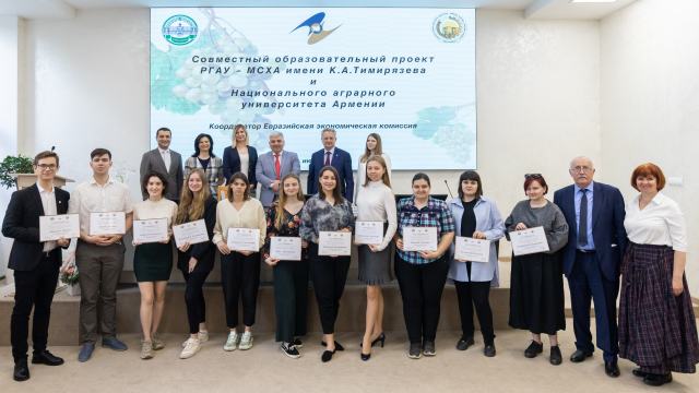 Церемония вручения сертификатов по итогам курса проходила сразу в двух университетах – в Тимирязевской академии и Национальном аграрном университете Армении. С успешным завершением образовательной программы студентов поздравил ректор РГАУ-МСХА, Академик РАН, профессор В.И. Трухачев.