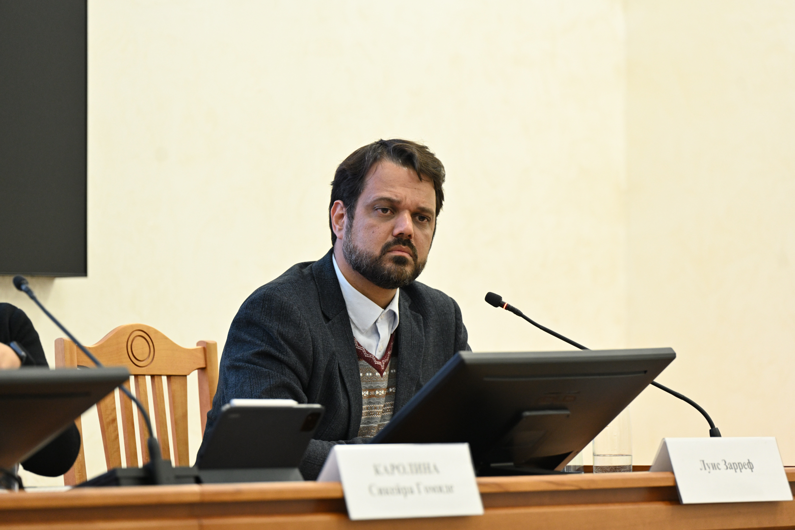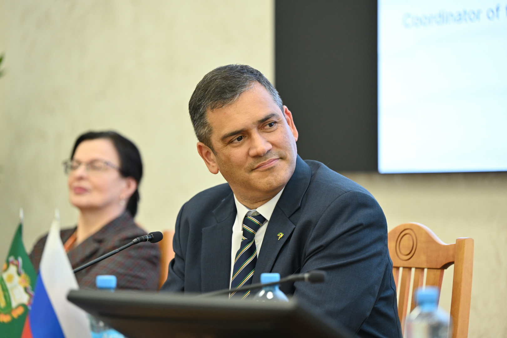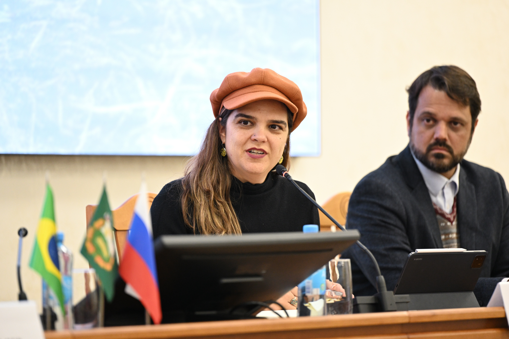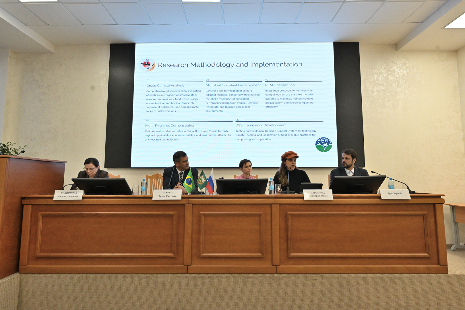 В обсуждении приняли участие: Илья Васенев, профессор кафедры экологии, заведующий лабораторией агроэкологического мониторинга, моделирования и прогнозирования экосистем, д.б.н.; Луис Зарреф, координатор по Латинской Америке Международной ассоциации народного сотрудничества; Представители Посольства Бразилии в России: Марко Тулио Сантьяго (атташе по сельскому хозяйству) и Густаво Гелфи де Фрейтас (руководитель экономического отдела).