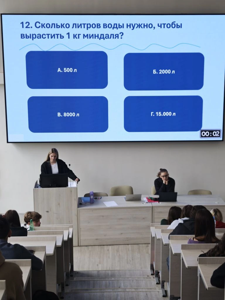 16 Апрель / 2026В ходе интеллектуальной игры участникам предстояло ответить на непростые вопросы, касающиеся скрытого потребления водных ресурсов. Например, студенты выясняли, сколько литров воды требуется для производства одной чашки кофе или создания новых джинсов, а также сколько водных ресурсов затрачивается на выращивание ключевых сельскохозяйственных культур.