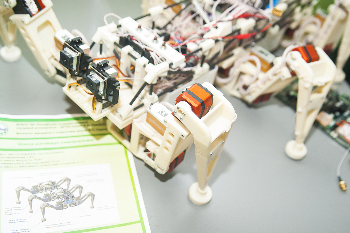 Тимирязевка предложила вниманию гостей стенда свои передовые изобретения. Например, ученые Института механики и энергетики имени В.П. Горячкина во главе с доктором технических наук, профессором Отари Дидманидзе разработали роботизированное шасси. Оно способно проводить различные научные исследования, передвигаясь по сложному рельефу, или самостоятельно собирать урожай в тепличных хозяйствах.