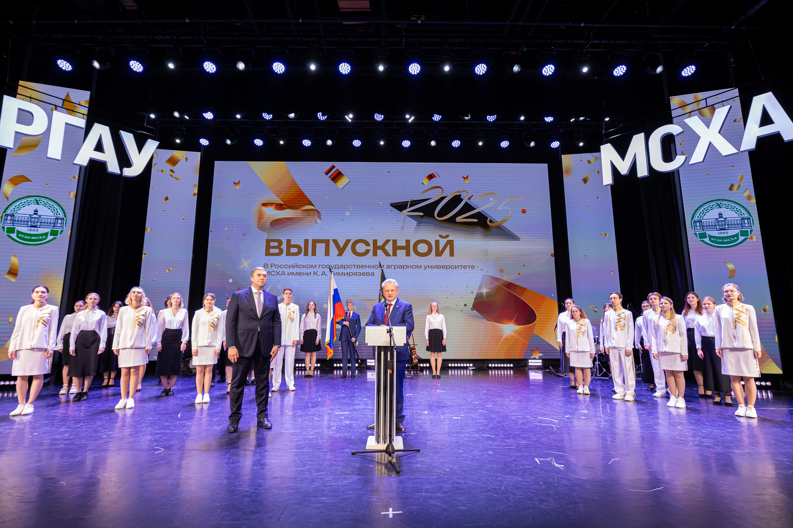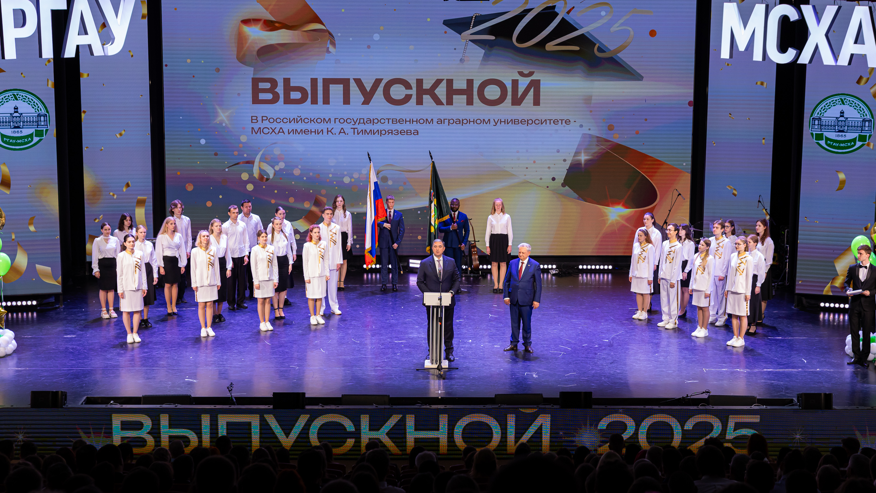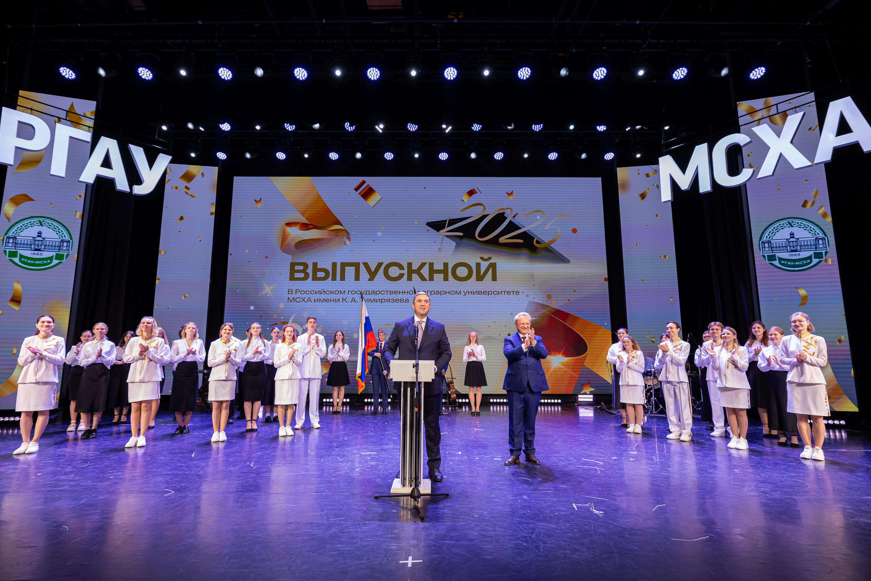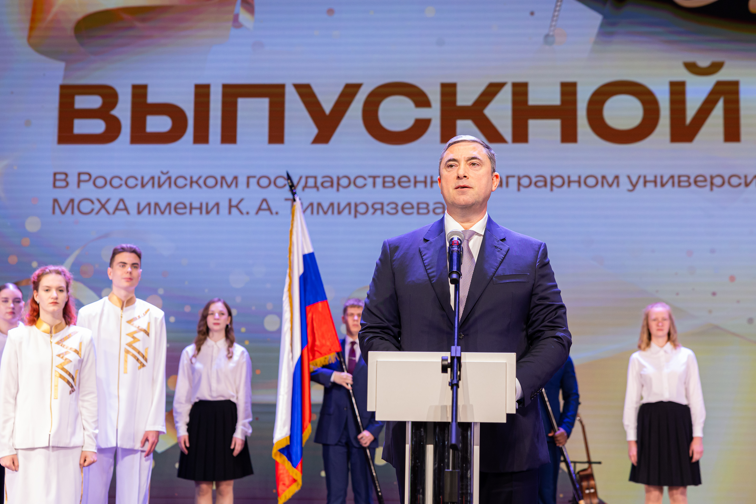 Выпускников приветствовал статс-секретарь, заместитель Министра сельского хозяйства Российской Федерации – Максим Иосифович Увайдов: «Наша великая страна, наша великая отрасль очень стремительно развивается. Несмотря ни на что, несмотря на санкции, мы остаемся стабильным поставщиком продовольствия не только на внутренний рынок, но и на рынке более чем 150 стран мира. Эту аграрную революцию произвели выпускники аграрных вузов, и в первую очередь выпускники главного аграрного вуза. Я вам желаю уже трудовых успехов. В добрый путь!»