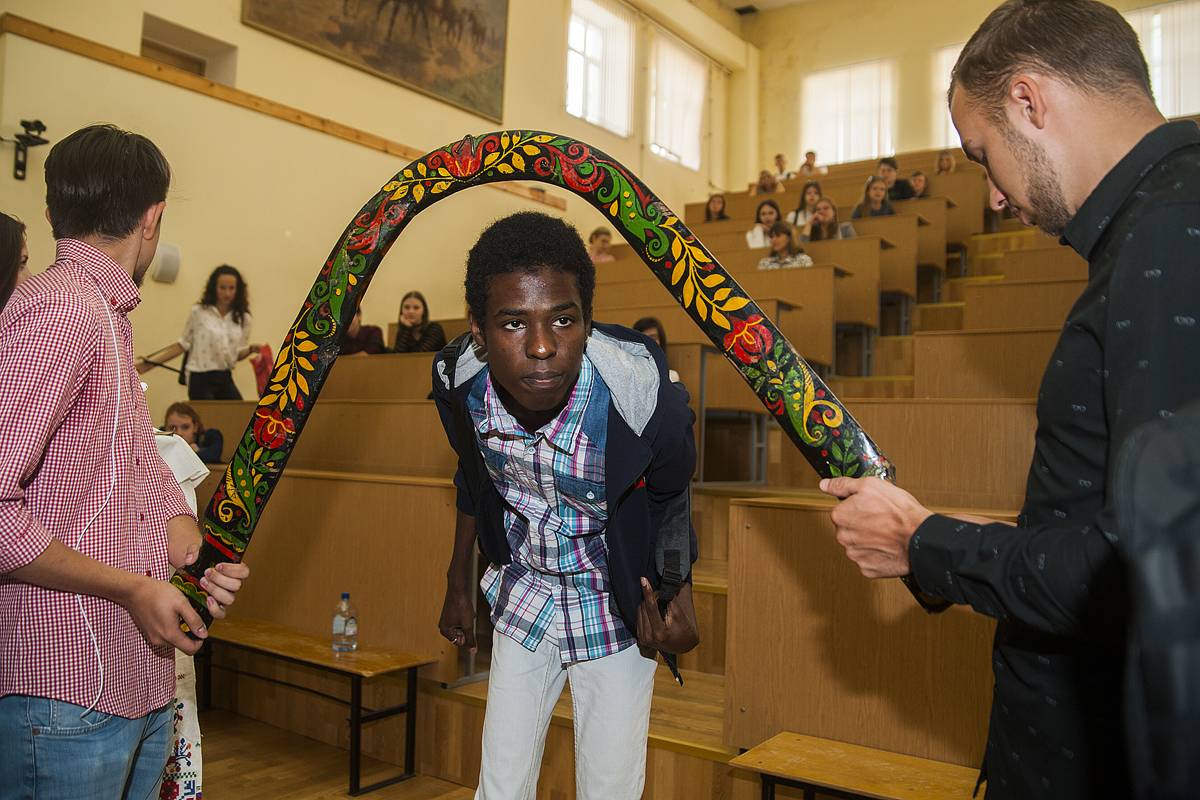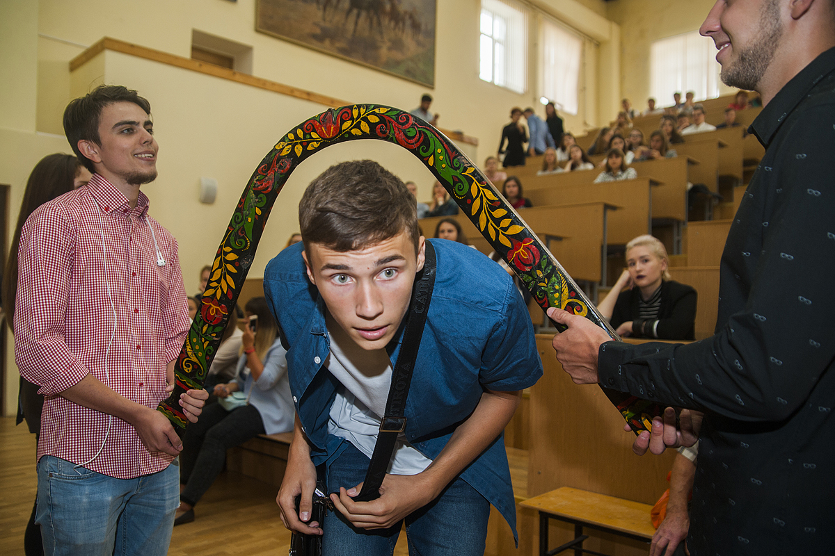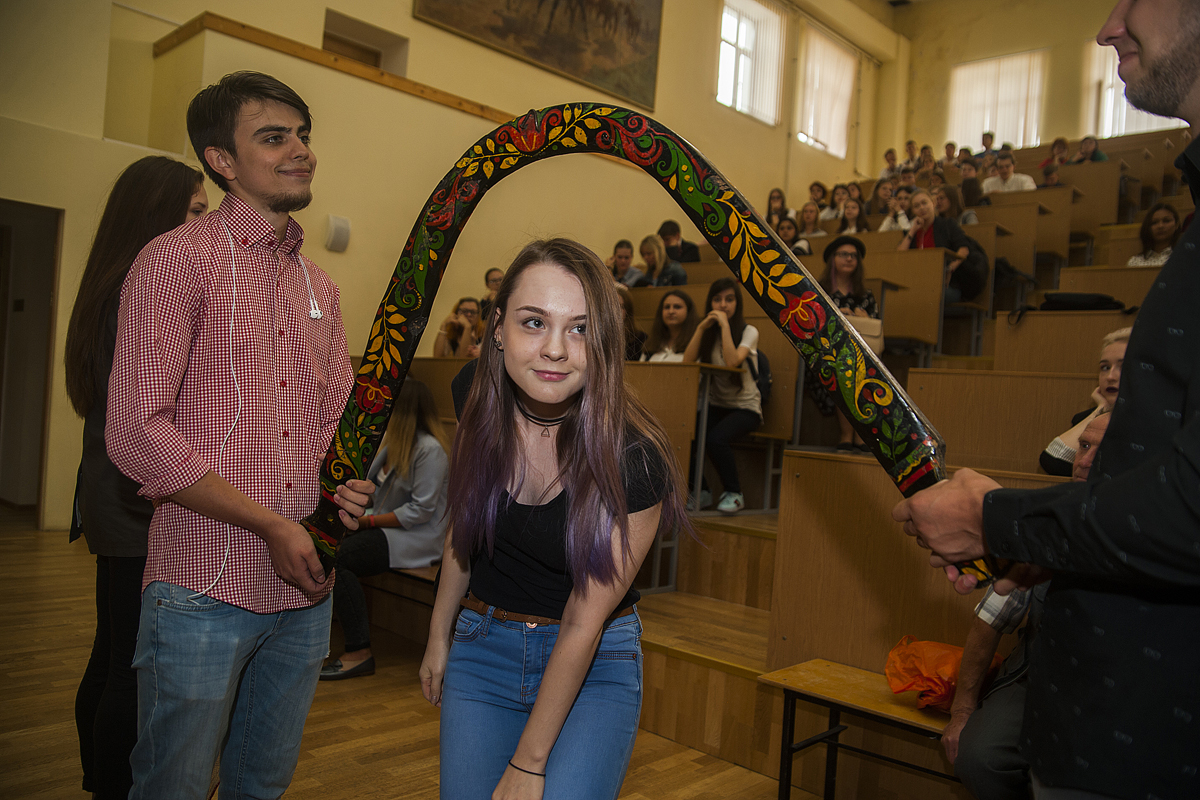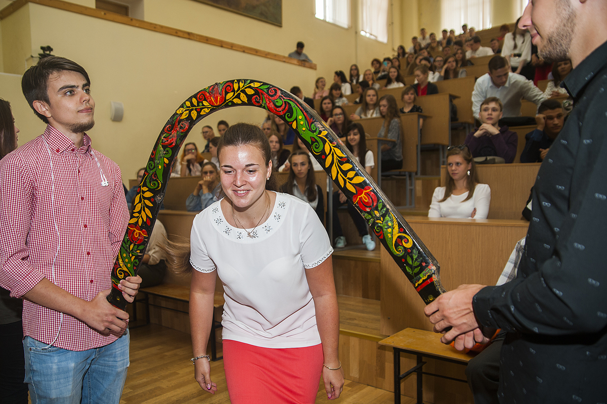 Наконец, факультет зоотехнии и биологии приготовил необычное посвящение для первокурсников. Помимо приветственных речей проректора по связям с общественностью и молодежной политике Сергея Куницы, декана Юсупа Юлдашбаева и кураторов направлений подоготовки, учащихся 1 курса ждал красивый ритуал, которому уже не один десяток лет. Перед тем, как получить заветный студенческий билет, ребята должны были потереть подкову на счастье и пройти под дугой для упряжки лошади. Считается, что традиция помогает без лишних сложностей пройти студенческий путь в главном аграрном.