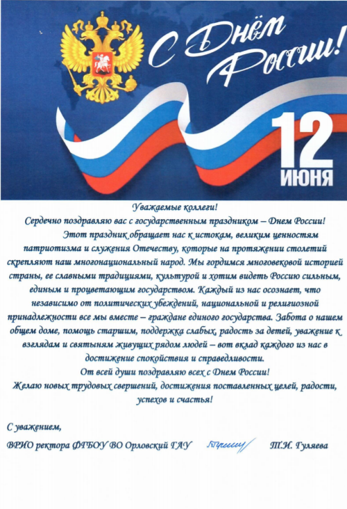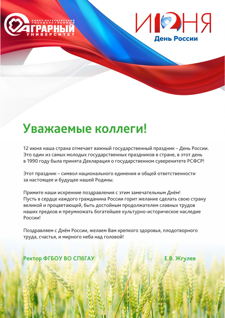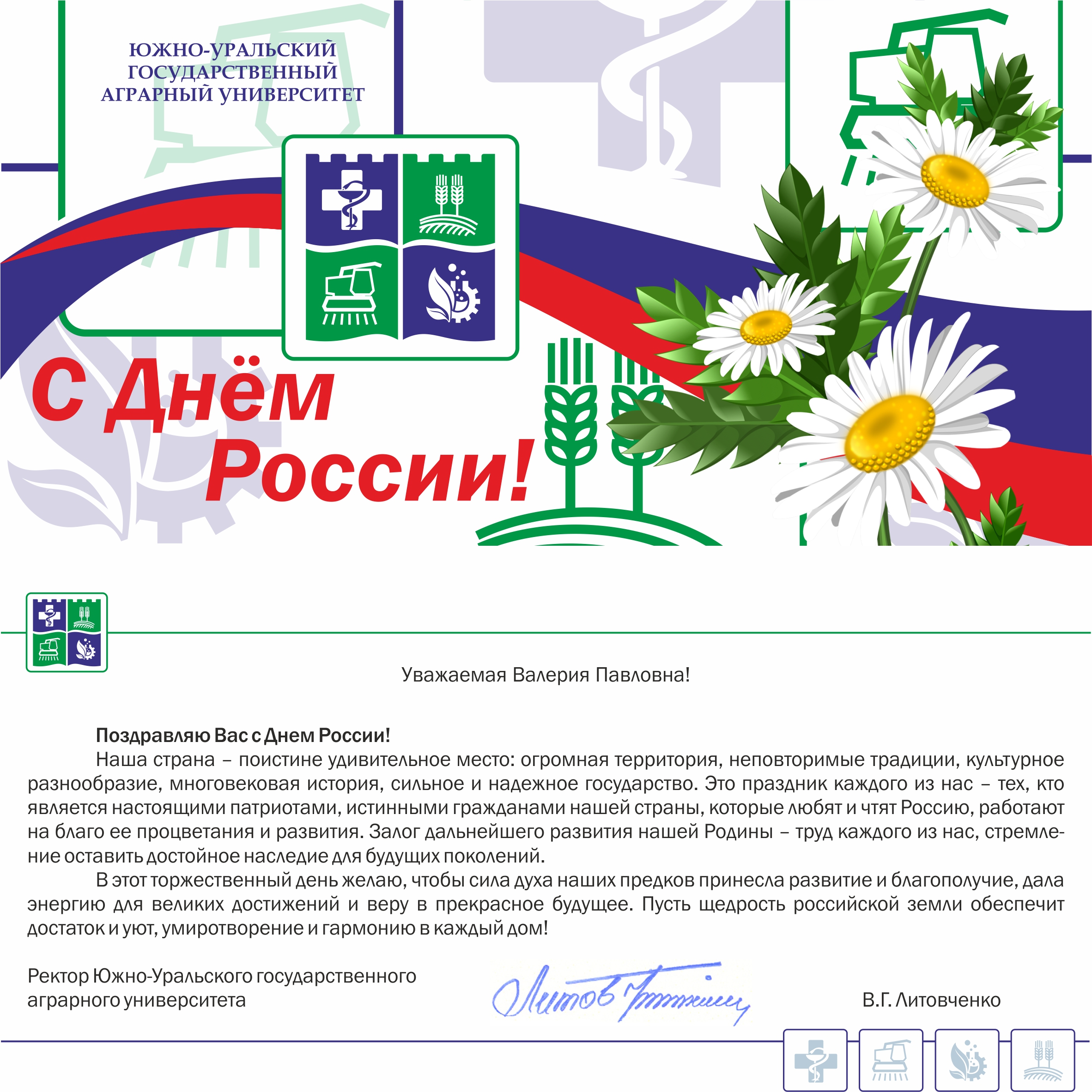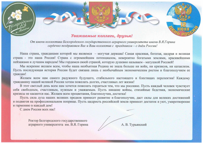 13 Июнь / 2019В адрес университета и лично и.о. ректора Валерии Чайки поступили поздравительные адреса из аграрных вузов: Мичуринского ГАУ, Южно-Уральского ГАУ, Белгородского ГАУ, Пензенского ГАУ Орловского ГАУ, Кубанского ГАУ, Санкт-Петербургского ГАУ, Волгоградского ГАУ, Донского ГАУ, Бурятской ГСХА имени В.Р. Филиппова, Российского государственного заочного университета, Рязанского государственного агротехнического университета имени П.А. Костычева, Санкт-Петербургской государственной академии ветеринарной медицины, Азово-Черноморского инженерного института Донского ГАУ.