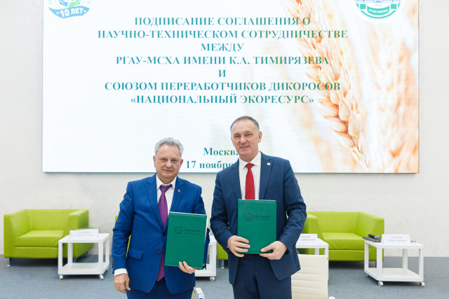 РГАУ-МСХА имени К.А. Тимирязева и Союз переработчиков дикоросов «Национальный экоресурс» заключили соглашение о сотрудничестве. Подписи под документом поставили ректор, Академик РАН, профессор Владимир Иванович Трухачев и президент объединения Юрий Леонидович Рудаков. Торжественное подписание состоялась в рамках Форума заготовителей и переработчиков дикоросов.