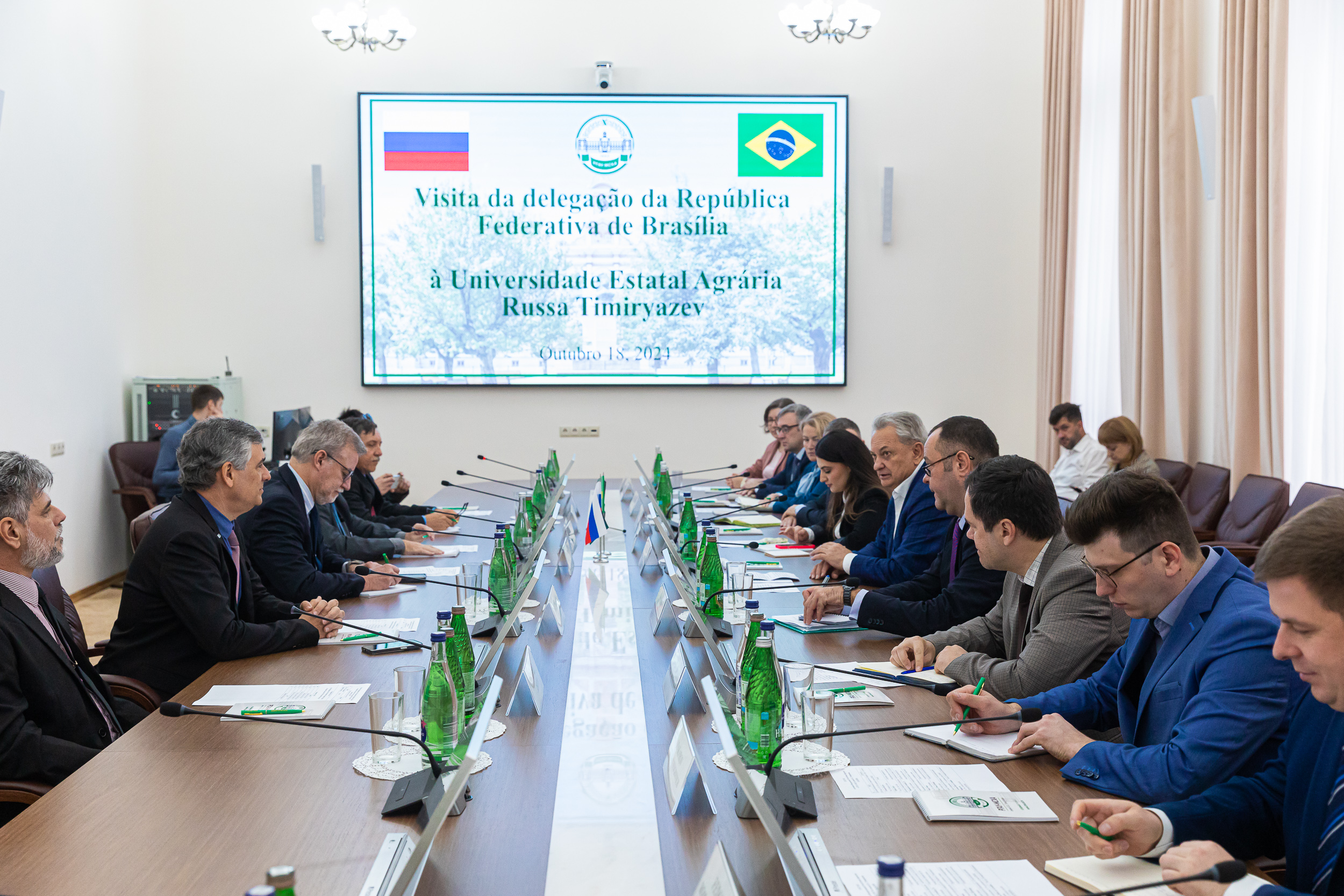 Делегация руководителей вузов Республики Бразилия посетила Тимирязевскую академию. Развитие сотрудничества и реализацию совместных научных и образовательных проектов с бразильскими партнерами обсудил ректор РГАУ-МСХА имени К.А. Тимирязева, Академик РАН, профессор Владимир Иванович Трухачев.