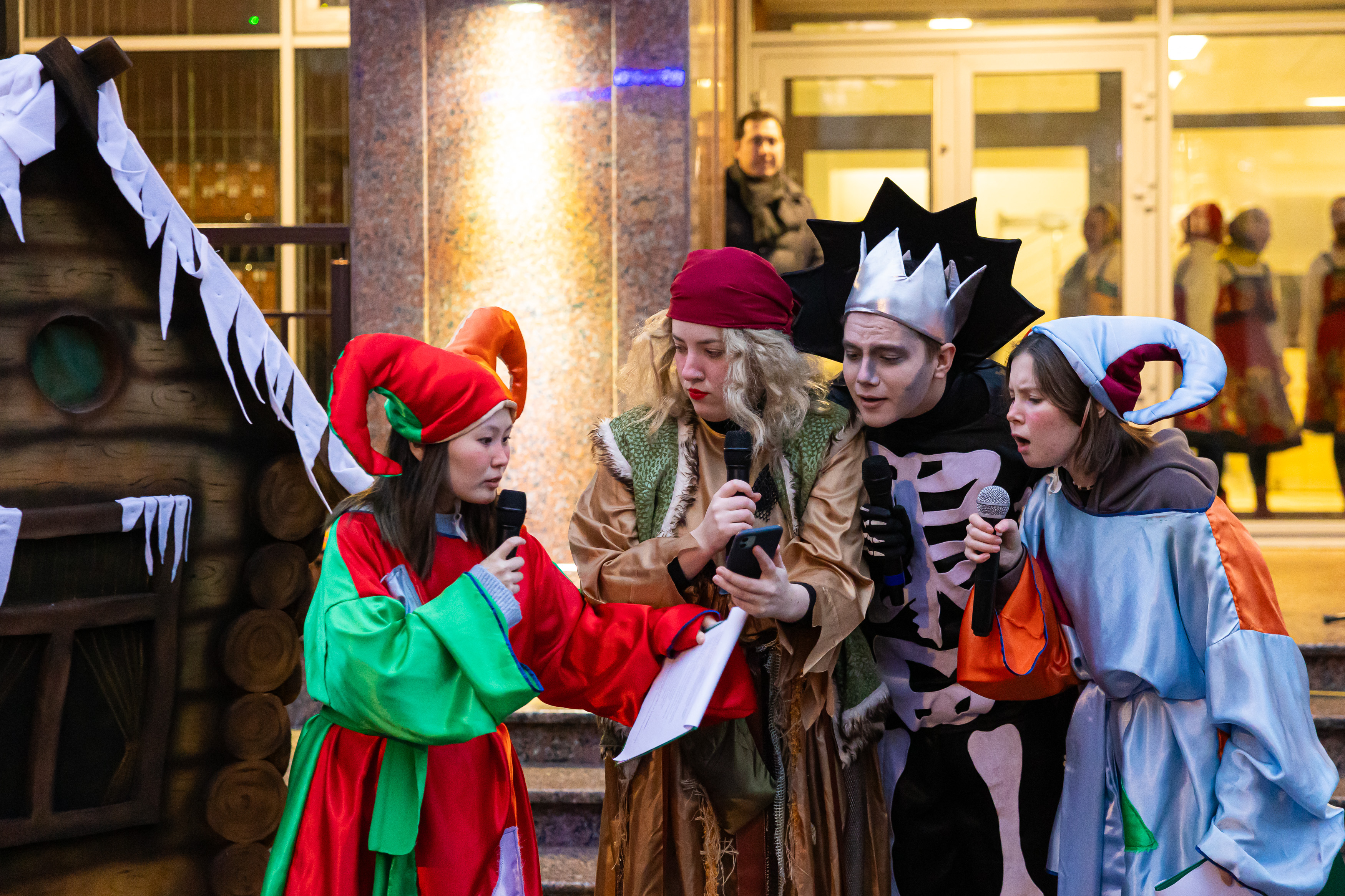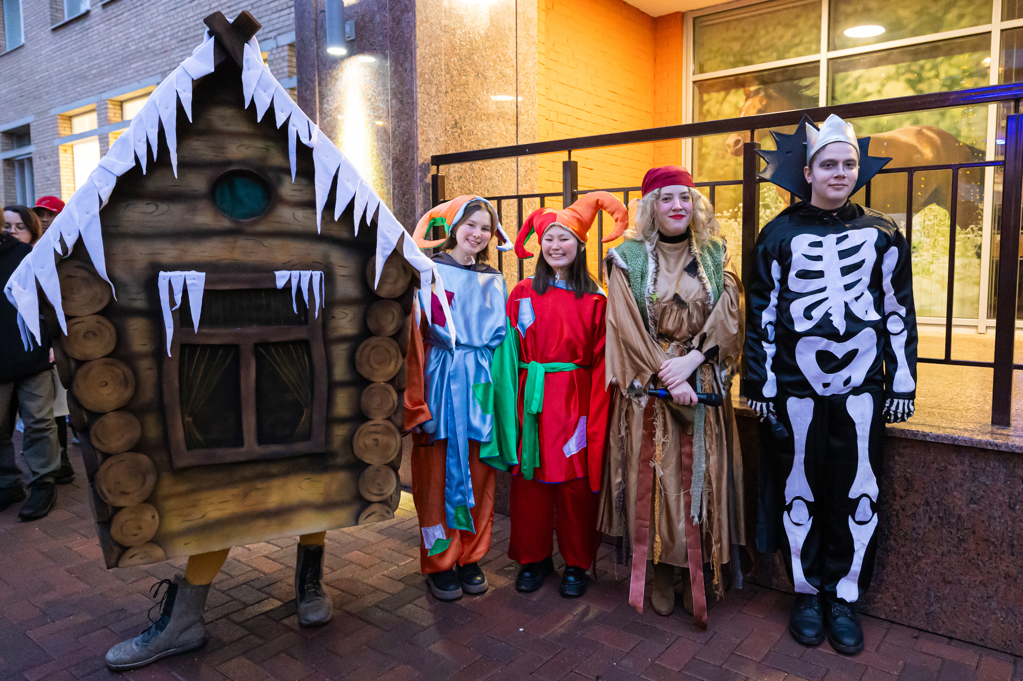 17 Декабрь / 2025Праздник начался с шуток, задора и необычных ведущих: Баба Яга, Кощей Бессмертный и веселые Скоморохи вместе с «танцующей избушкой» создали по-настоящему новогоднее настроение. Их главной задачей было заманить в гости Деда Мороза и Снегурочку, а для этого, как известно, нужны песни и танцы.