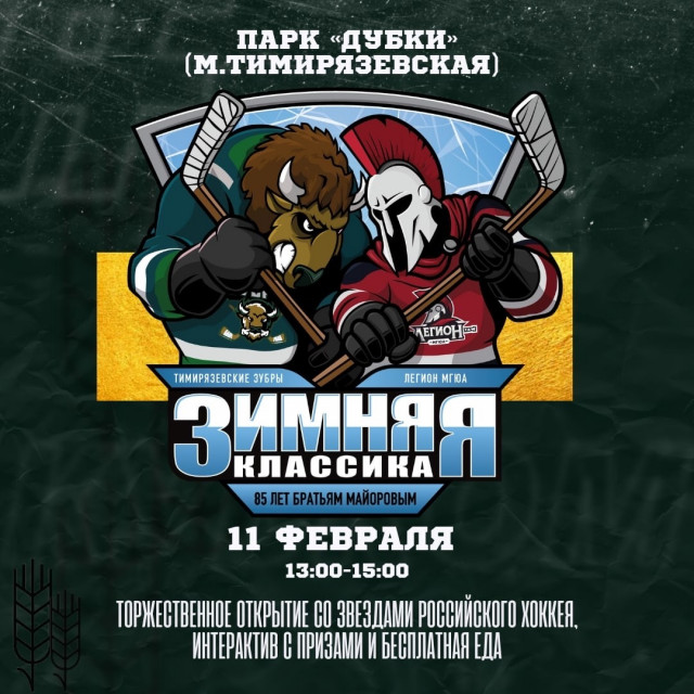 В субботу, 11 февраля в 13.00 в парке «Дубки» Северного административного округа Москвы Тимирязевская академия и ХК «Тимирязевские Зубры» подготовили самое запоминающееся событие зимы - праздник «Зимняя классика». Это будет хоккей под открытым небом!