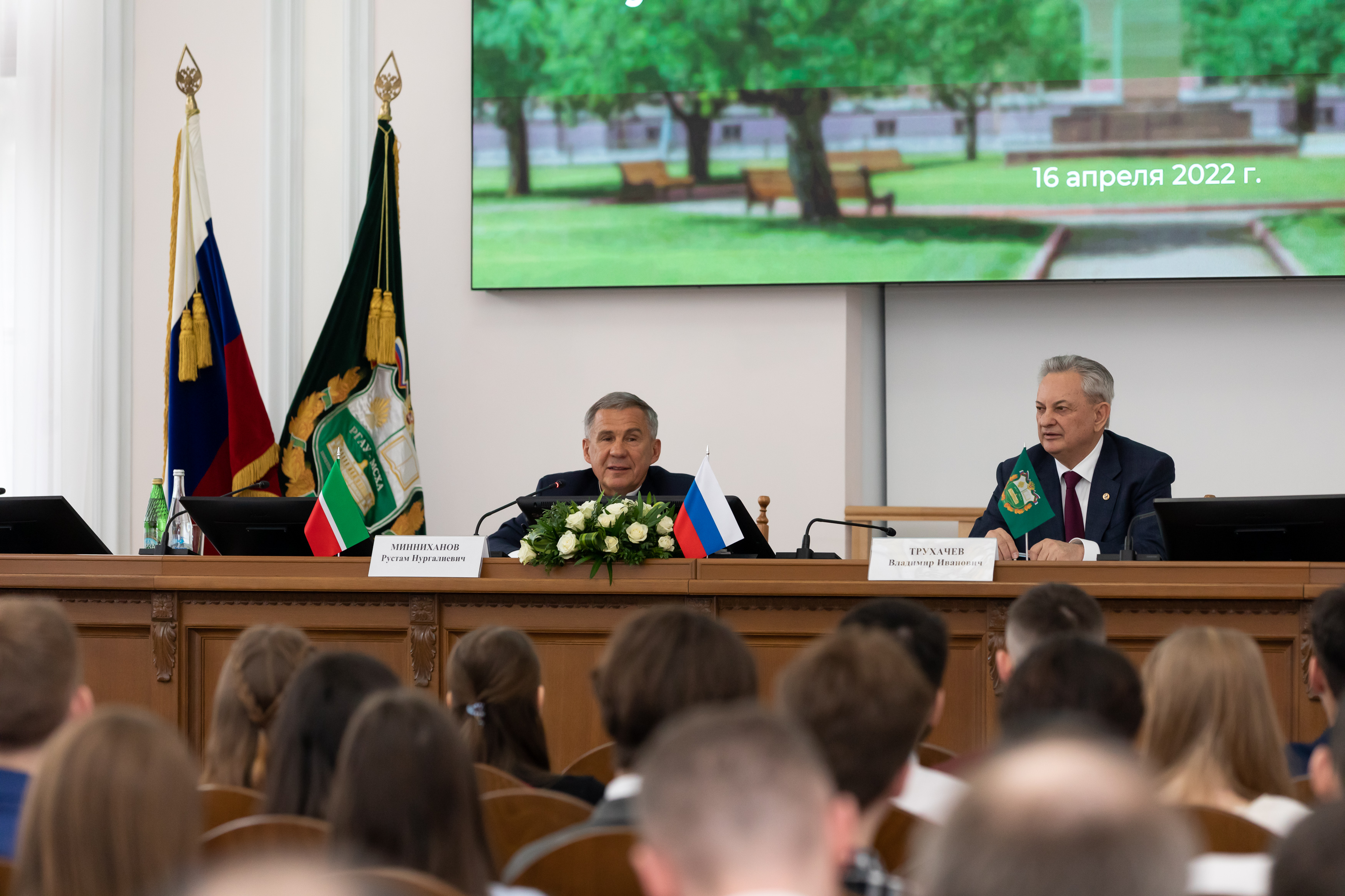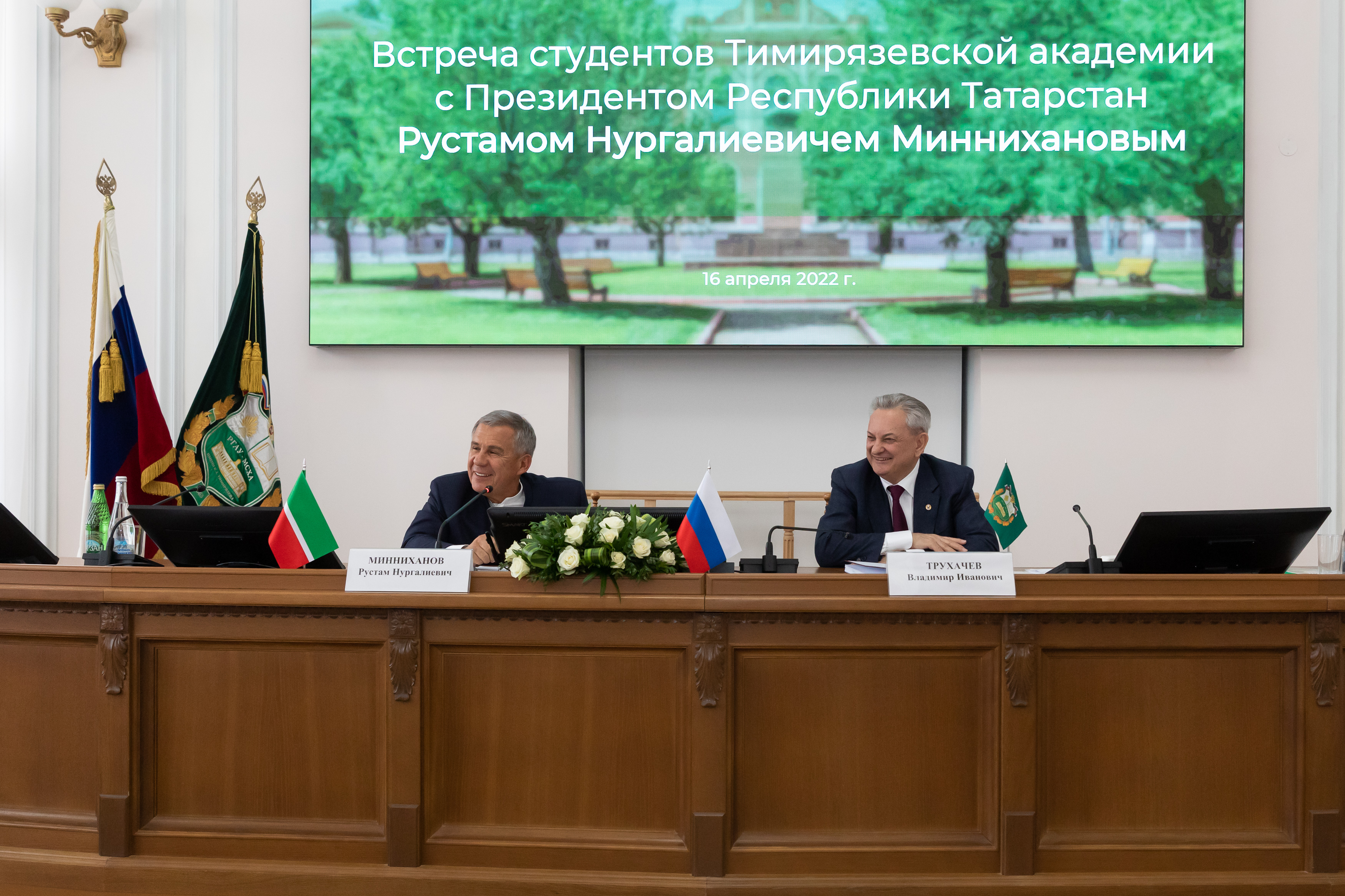 Р.Н. Минниханов провел встречу со студентами из Татарстана и посетил ряд научных и учебно-производственных подразделений университета. С главой республики обсудил перспективы сотрудничества ректор Тимирязевской академии, Академик РАН, профессор В.И. Трухачев.