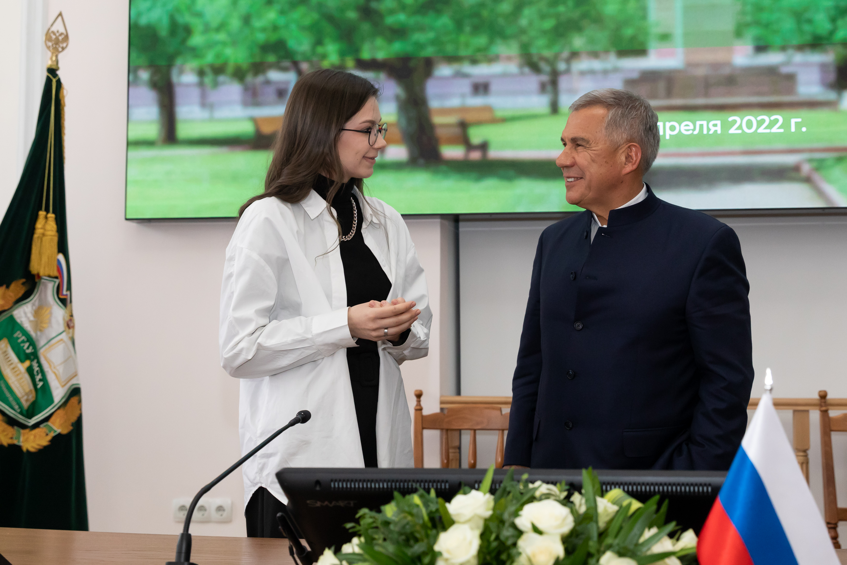 Ректор Владимир Трухачев вручил Рустаму Минниханову копию личного дела на соискание ученой степени доктора экономических наук по специальности «Экономика и управление народным хозяйством», которую глава Татарстана защищал в Тимирязевской академии в 2001 году.