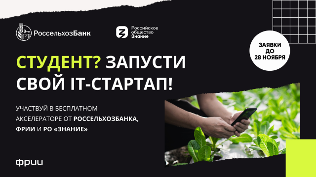 21 Ноябрь / 2022Россельхозбанк в партнерстве с ФРИИ и Российским обществом «Знание» начал прием заявок от студентов российских вузов на участие в студенческом агротех-акселераторе. Участие смогут принять студенты старших курсов бакалавриата, специалитета или магистратуры, а также аспиранты и молодые ученые, у которых есть инновационные решения для развития технологий и сервисов на платформах экосистемы «Своё» от РСХБ или идеи по запуску своего агротехнологического стартапа. В акселератор могут пройти также участники, которые обладают высокими компетенциями и мотивированы на работу в агросекторе.