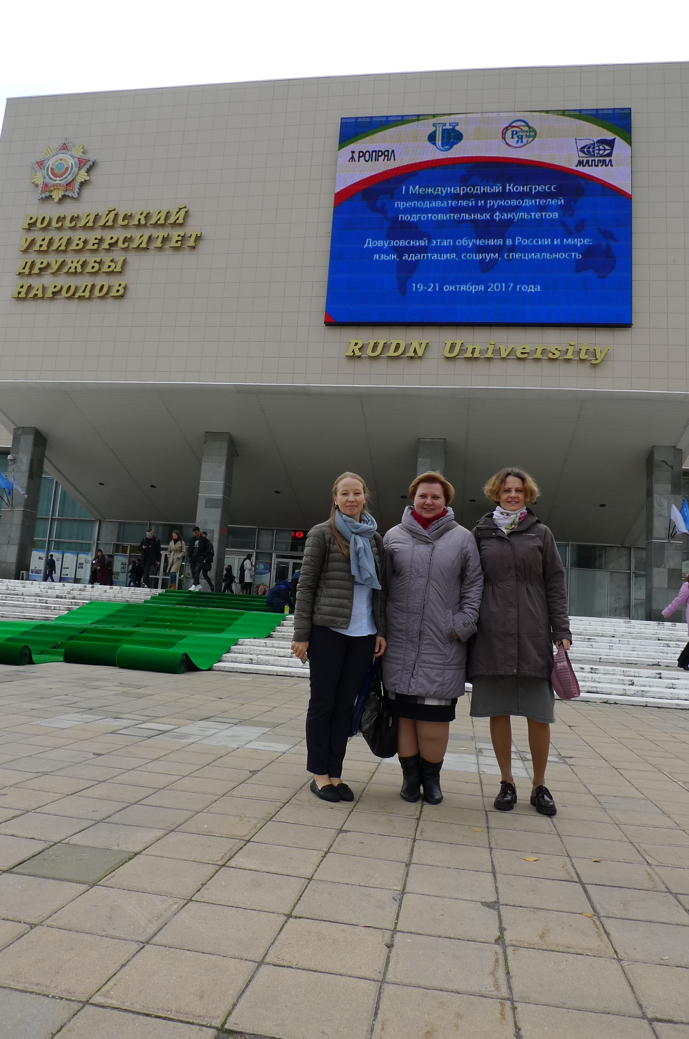 Заведующая подготовительным отделением для иностранных граждан Наталья Артюхова и преподаватели отделения - Ольга Сайкина, Наталья Полищук, Оксана Цибизова, Елена Черкашина и Елена Новик принимают участие в работе I-го Международного конгресса преподавателей и руководителей подготовительных факультетов, который проводится с 19 по 21 октября на базе факультета русского языка и общеобразовательных дисциплин Российского университета дружбы народов (РУДН).