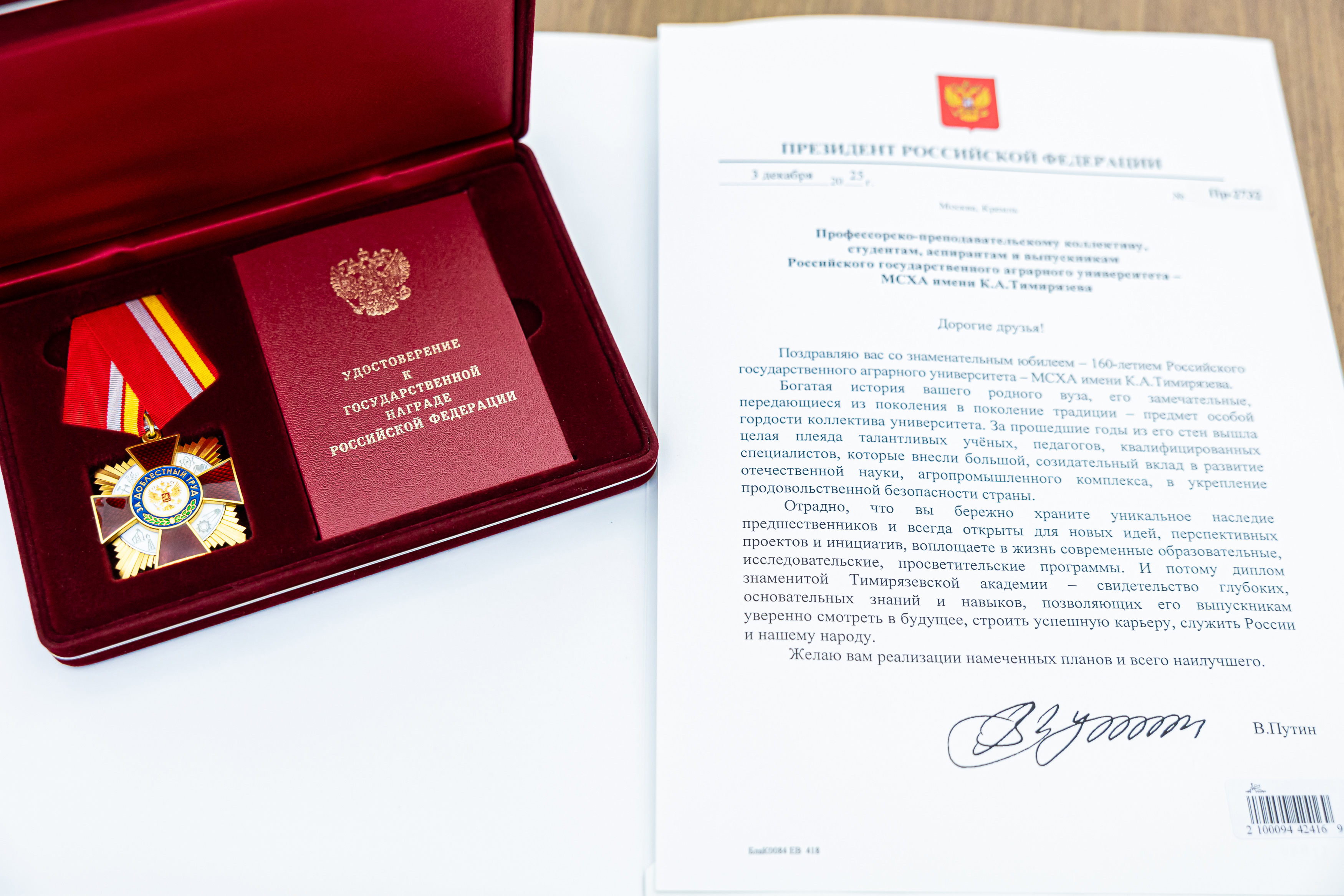 Высокая государственная награда была вручена академии в Государственном Кремлёвском дворце 3 декабря 2025 года в рамках празднования 160-летнего юбилея университета. Награду от имени Президента вручил заместитель председателя Правительства РФ Дмитрий Патрушев, подчеркнувший огромный вклад Тимирязевки в развитие аграрной науки, образования и кадрового потенциала страны.