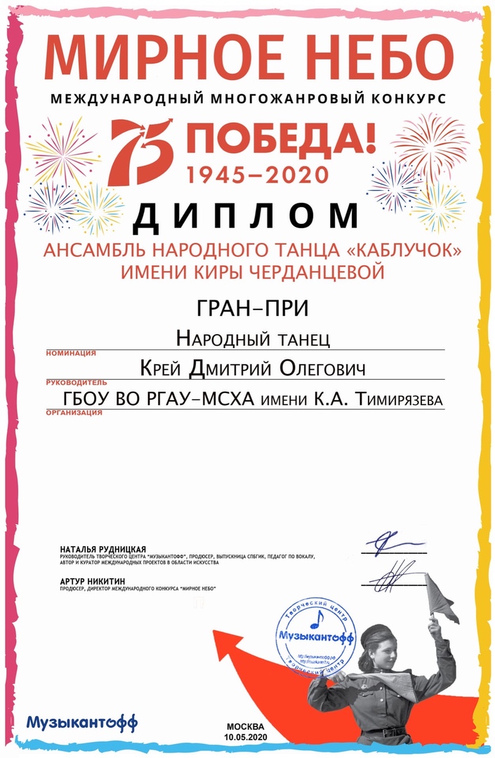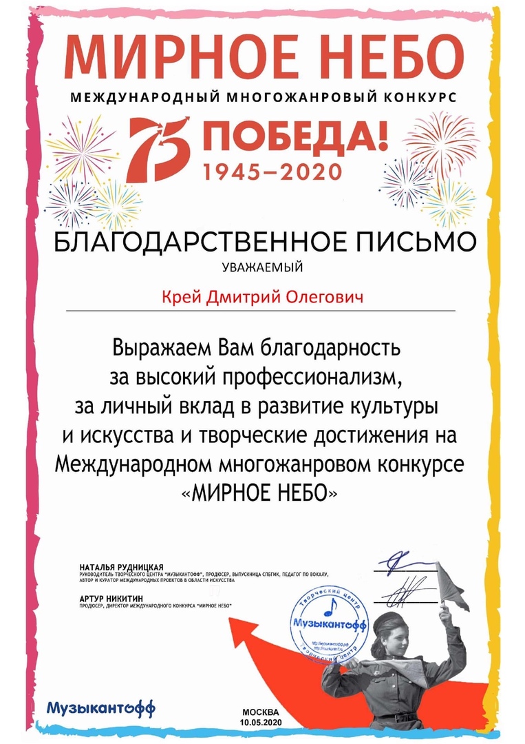 За высокий профессионализм, личный вклад в развитие культуры и искусства наставник ансамбля Д.О. Крей был удостоен Благодарственного письма от организаторов конкурса.