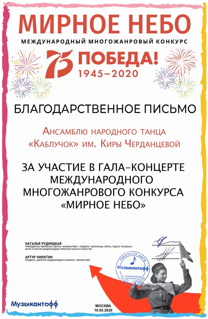 Кроме того, «Каблучок» стал обладателем Гран-при Международного многожанрового конкурса «Мирное небо», приуроченного ко Дню памяти и скорби. Фестиваль был организован творческим центром «Музыкантофф».