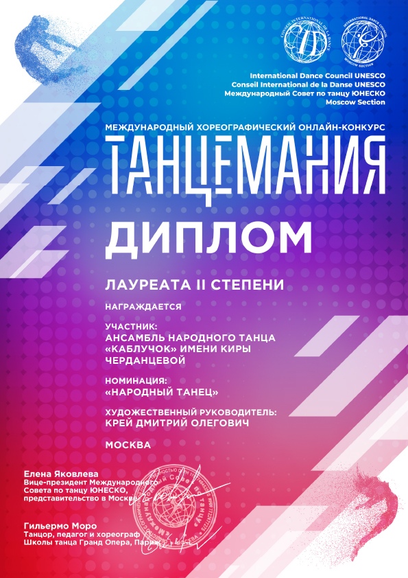 Ансамбль «Каблучок» принял участие в престижном Международном конкурсе хореографического искусства «Танцемания», который проводился в XI раз. Его организатором выступил Международный Совет по Танцу (CID), который является официальным партнером ЮНЕСКО. CID UNESCO объединяет наиболее важные международные, национальные и местные организации, а также профессионалов танцевальной культуры.