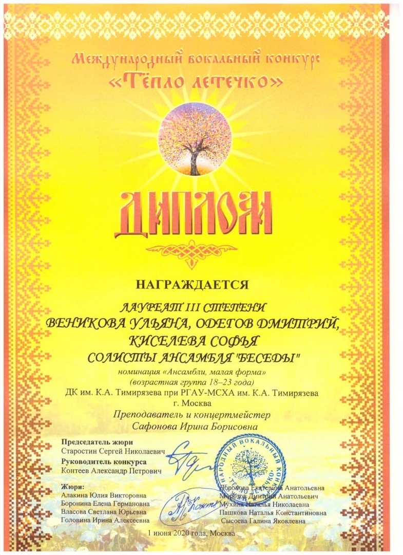 За искусное выступление тимирязевских исполнителей Ульяну Веникову, Дмитрия Одегова и Софью Киселёву жюри конкурса наградило дипломом Лауреата III степени в номинации «Фольклорно-этнографическое исполнительство».