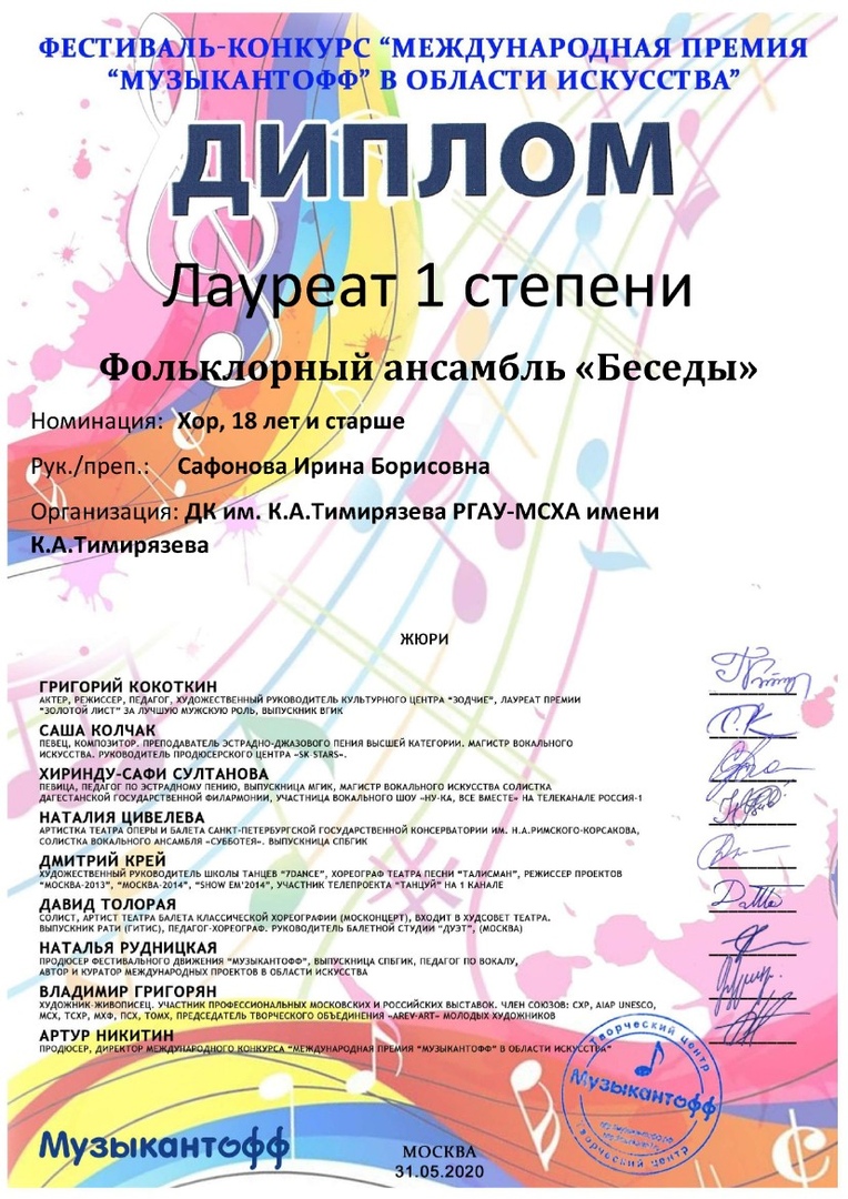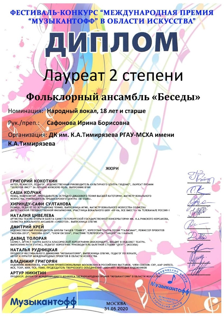 Под эгидой творческого центра «Музыкантофф» состоялся еще один онлайн-конкурс - Международная премия «Музыкантофф» в области искусства», участие в которой принял фольклорный ансамбль «Беседы». Помимо тимирязевцев, в событии участвовали исполнители из России, Беларуси, Литвы, Молдовы, Казахстана, Кыргызстана и других стран.