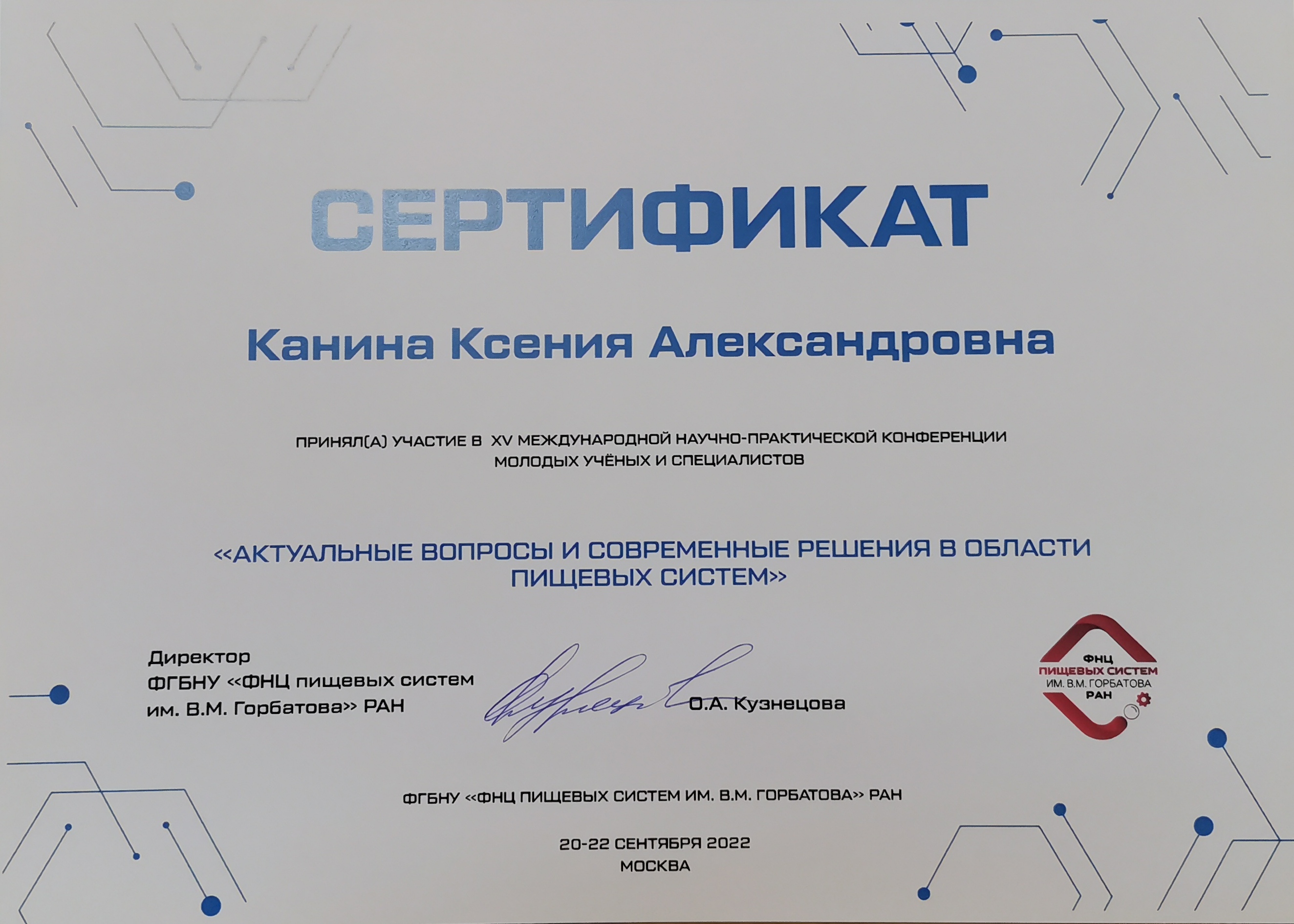 20-22 сентября представители кафедры Технологии хранения и переработки продуктов животноводства - магистр Петр Атанасов, аспирант Алла Горлова, старший преподаватель, к.т.н. Ксения Канина приняли участие в XV Международной научно-практической конференции молодых ученых и специалистов «Актуальные вопросы и современные решения в области пищевых систем», проходившей в Федеральном научном центре пищевых систем им. В.М. Горбатова РАН в секции постерных докладов.