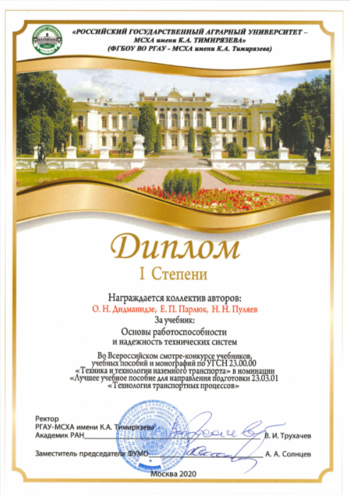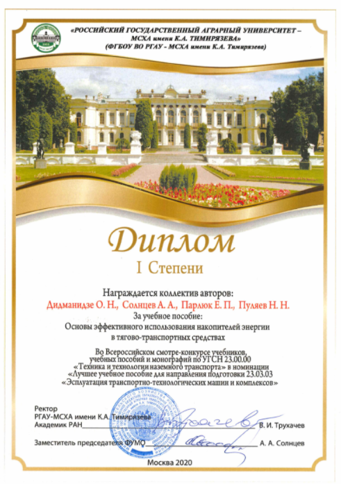 В числе победителей были представлен Институт механики и энергетики имени В.П. Горячкина. Дипломами I степени были отмечены учебник «Основы работоспособности и надежность технических систем» (коллектив авторов - О.Н. Дидманидзе, Е.П. Парлюк, Н.Н. Пуляев) и учебное пособие «Основы эффективного использования накопителей энергии в тягово-транспортных средствах» (Авторы - О.Н. Дидманидзе, А.А. Солнцев Е.П. Парлюк, Н.Н. Пуляев).