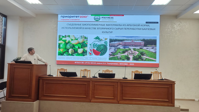 Профессор кафедры технологии хранения и переработки плодоовощной и растениеводческой продукции, д-р техн.наук, профессор Нугманов Альберт Хамед-Харисович привел примеры использования вторичного сырья переработки бахчевых культур в технологии съедобных биополимерных материалов из арбузной корки. Экспонат отмечен Дипломом и золотой медалью Российской агропромышленной выставки «Золотая Осень -2023» и нашел практическое применение на предприятиях Астраханской области.