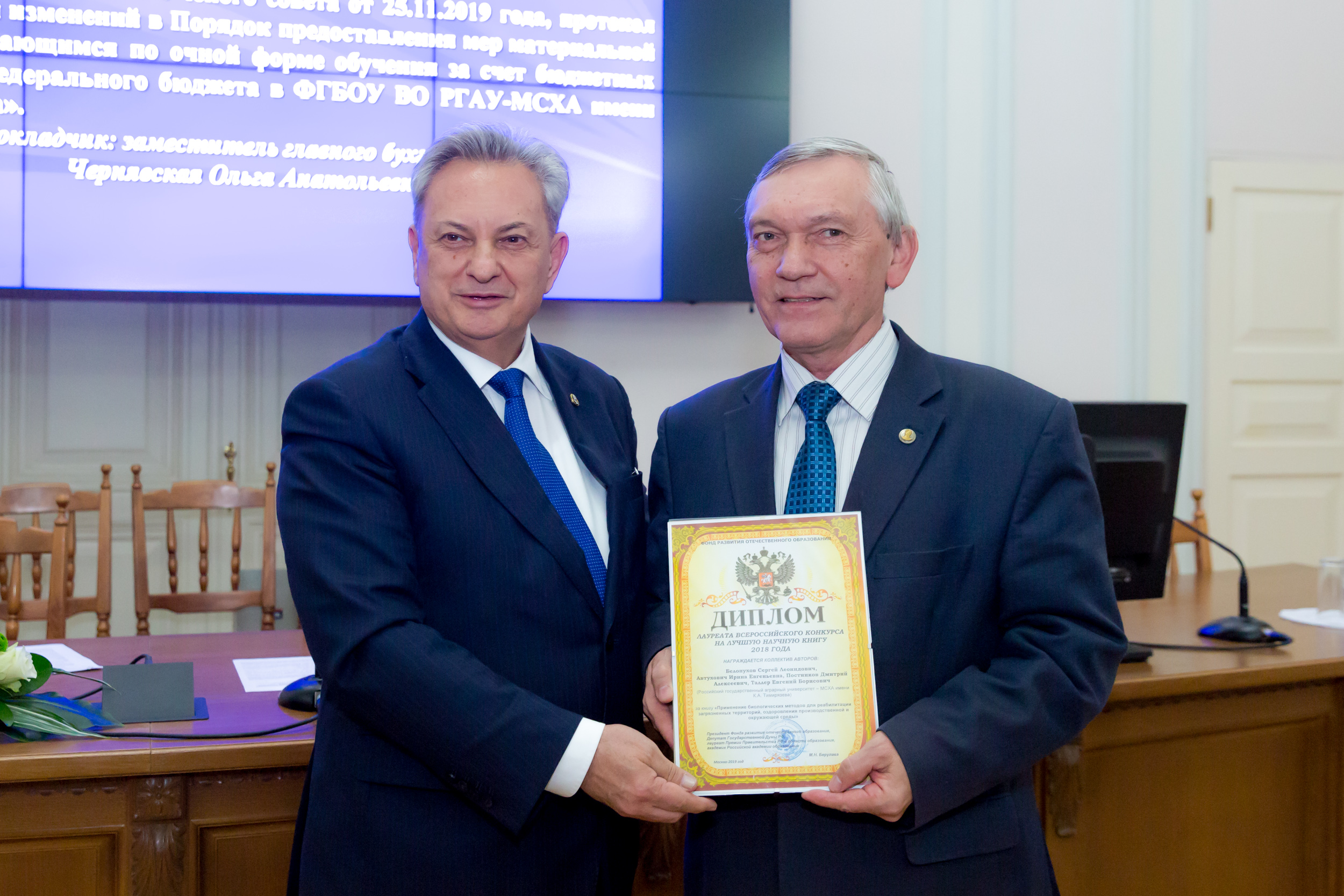 На заседании Ученого совета руководитель РГАУ-МСХА имени К.А.Тимирязева, академик РАН, профессор Владимир Иванович Трухачев вручил награды профессору кафедры химии Сергею Леонидовичу Белопухову и и.о. директора Института мелиорации, водного хозяйства и строительства имени А.Н. Костякова Дмитрию Михайловичу Бенину.